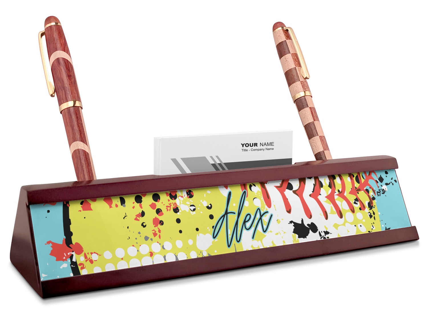 Your desk name plates are crafted from a high-quality, dark-cherry mahogany. At approximately 9.5 by 1.875 by 2.5 inches, this name plaque will fit perfectly, front and center, on your desk. Your customization spans across the entire face of the nameplate. Behind the nameplate lies a skinny slot that can fit approximately 15, traditionally-sized, business cards. You can also store your writing utensils on either side of this custom desk name plate.