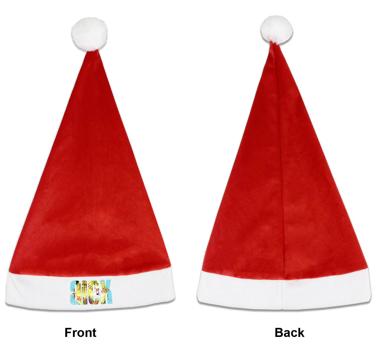 Our Santa hats are a soft, velvety polyester material. These customizable Santa hats are a classic red with white brimming and pom pom ball hanging off the hat tail just like Santa Claus! Each personalized Santa hat is approximately 17.5 L x 11.8 W. We offer two different styles to print your designs on the white brim - front or front & back.