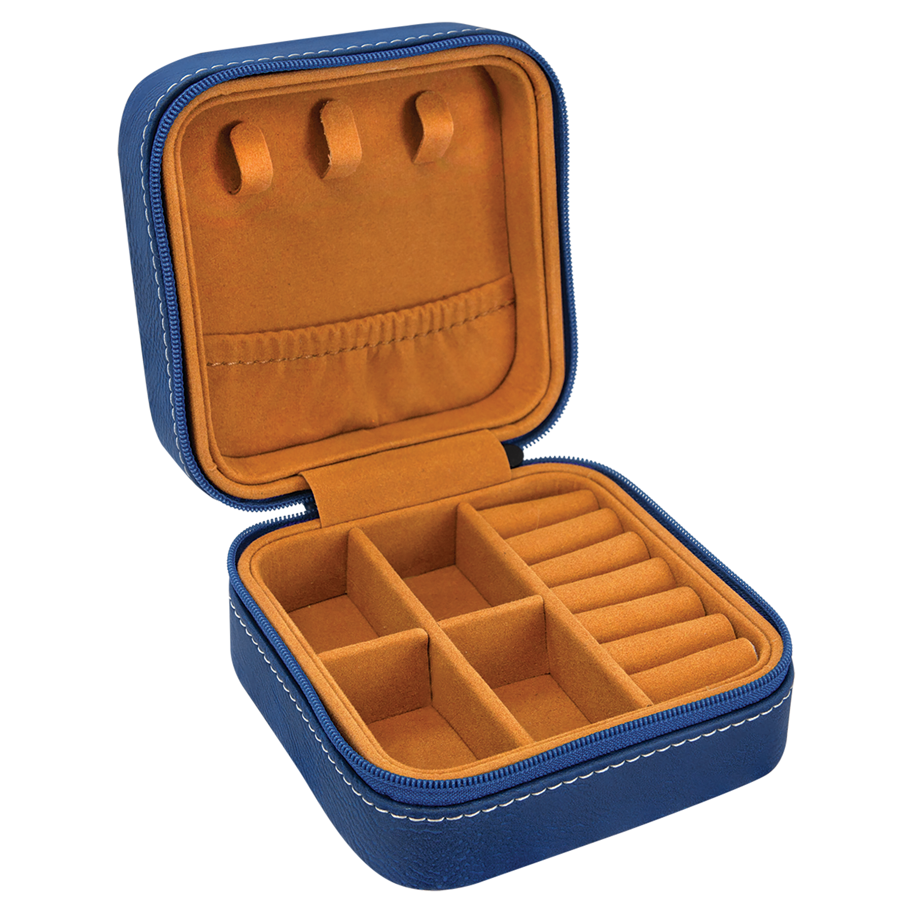 This square zippered travel jewelry box is made from leatherette and is available in four colors - classic cognac / rawhide, a beautiful teal. navy blue or pink. The tan colored soft velvet inside has compartments and hooks for all your jewelry - rings, chains, earrings, bangles etc.