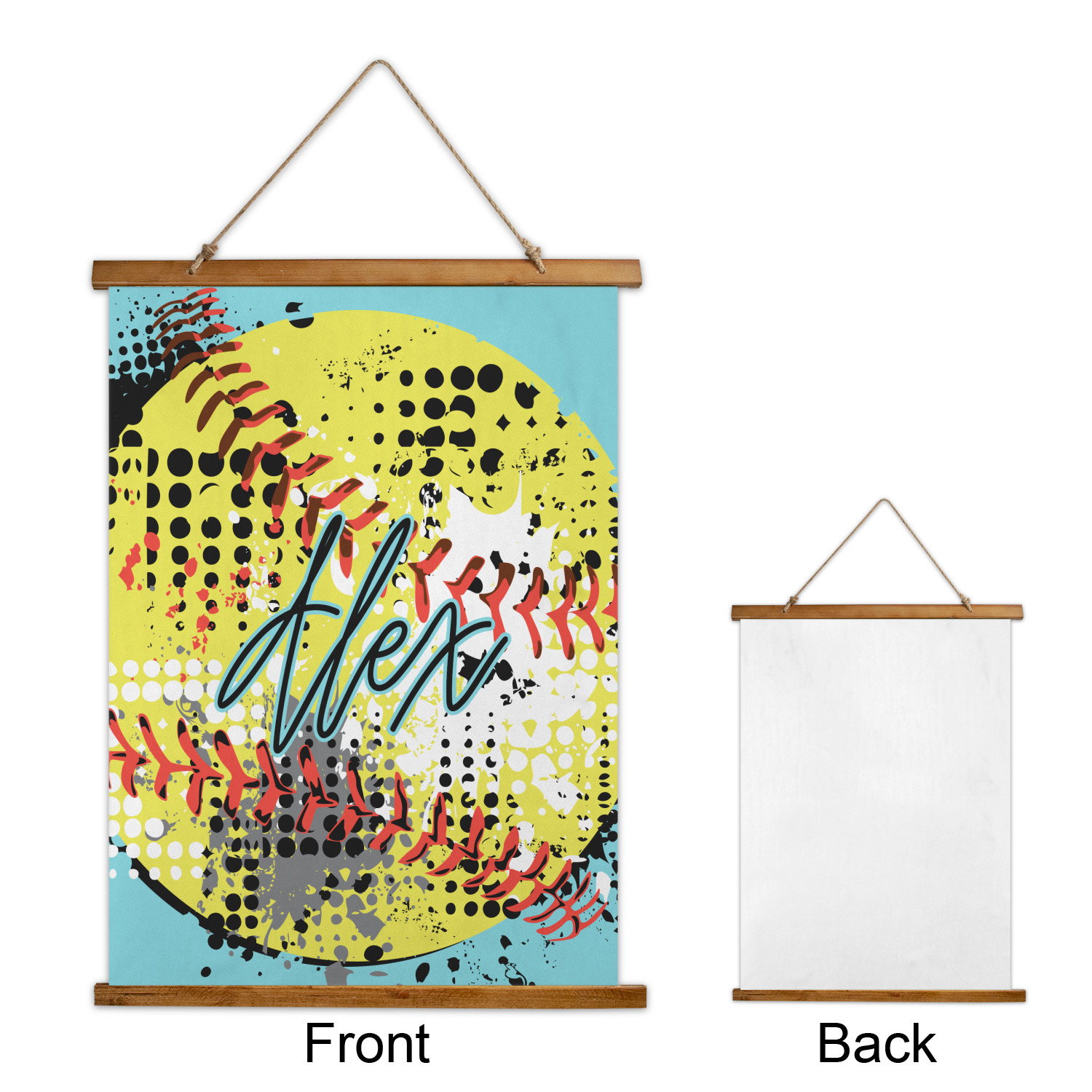 Made in two different orientations - portrait or landscape - both are 26" x 36". Your design is printed on a high quality polyester fabric with hemmed edges. The wood on the top and bottom of the tapestry is 1.25" tall and 0.25" thick and there are two pieces on top and bottom which sandwich the fabric.