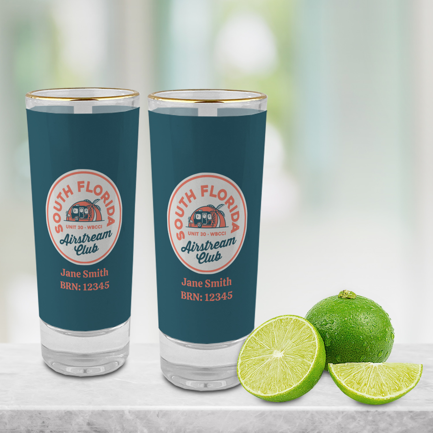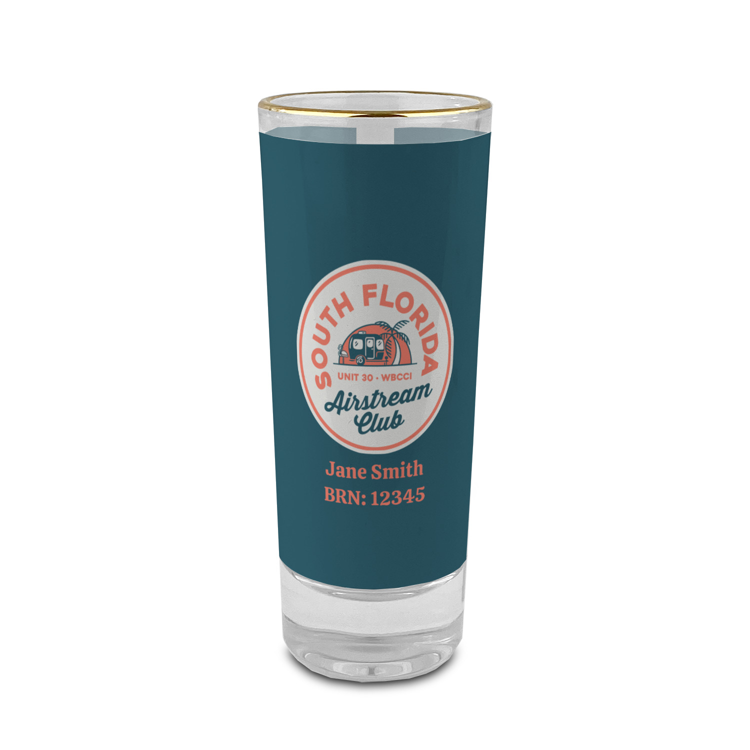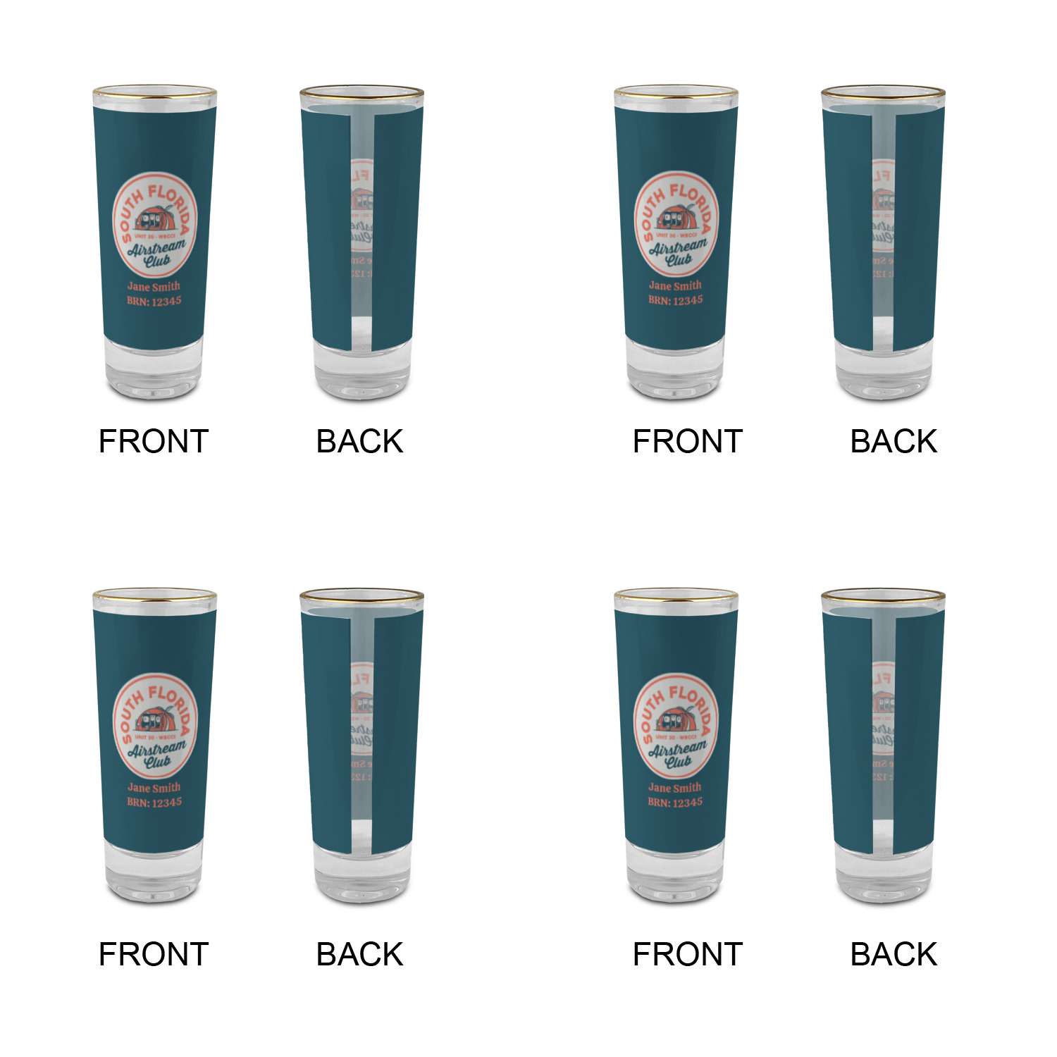 These glass shooter glasses are printed in full color with the design of your choice. These are a tall shooter 2 oz size and stand 4" tall. The print is a full wrap design to boldly display your personalization.