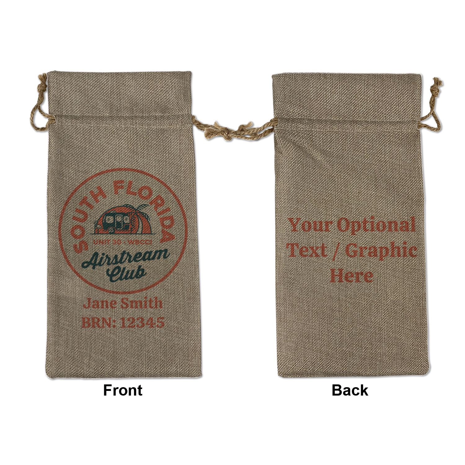 We sell our Burlap Gift Bags in 3 variant sized bags. Made with burlap polyester, each personalized bag can be secured with a twine drawstring pull. Your custom design is available to print on one side or both sides - completely up to you! The sizes of the bags measure approximately 4.5" x 6.5" for the smallest size, 6.5" x 8.0" for the medium size, and 6.5" x 13.5" for the large-sized bag.
