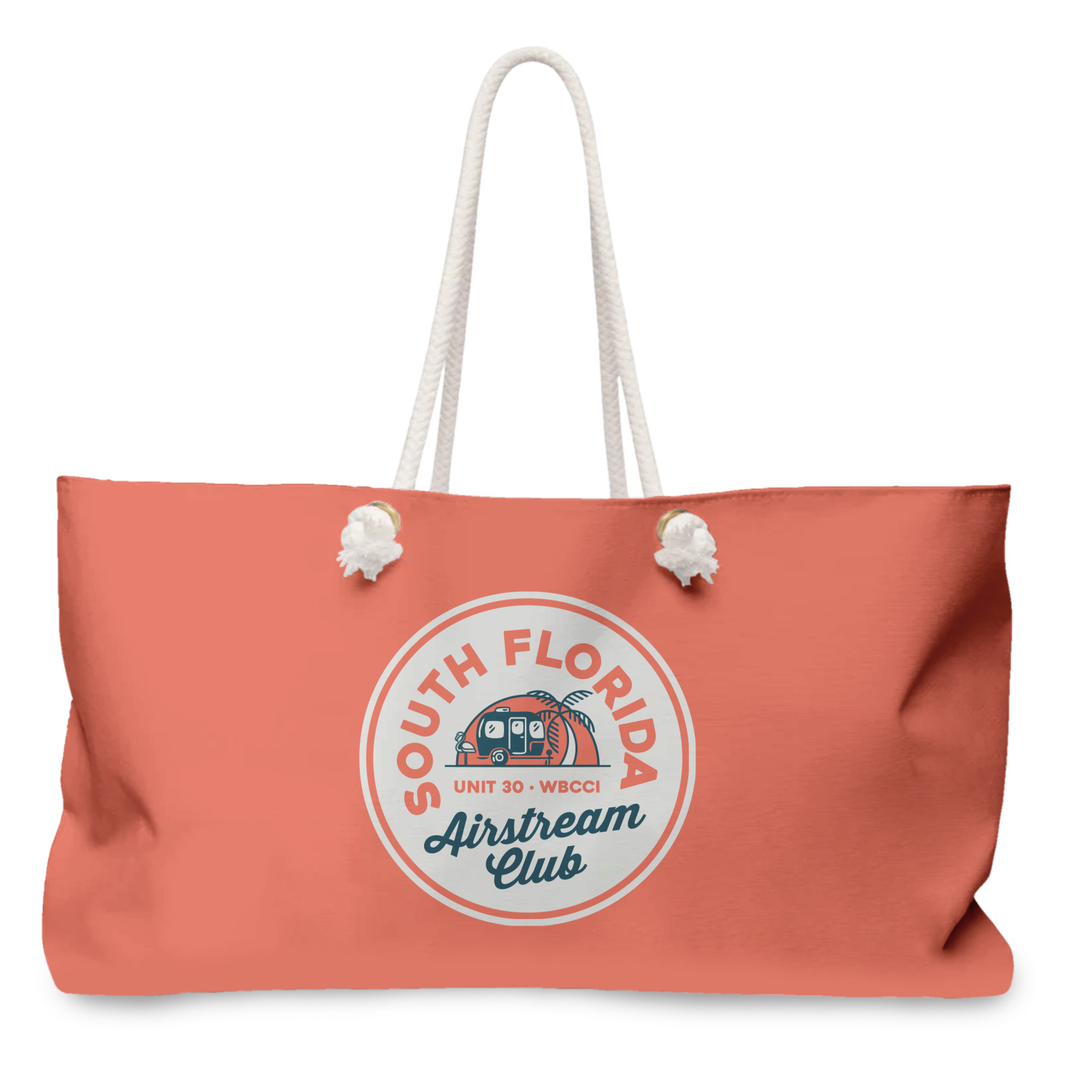 Our oversized weekender tote with rope handles is perfect for your weekend at the beach or on the town. This large tote are 24" W X 13" H, with a 5" gusset and a 27" thick rope handles with a knot that is put through a grommeted brass hole.