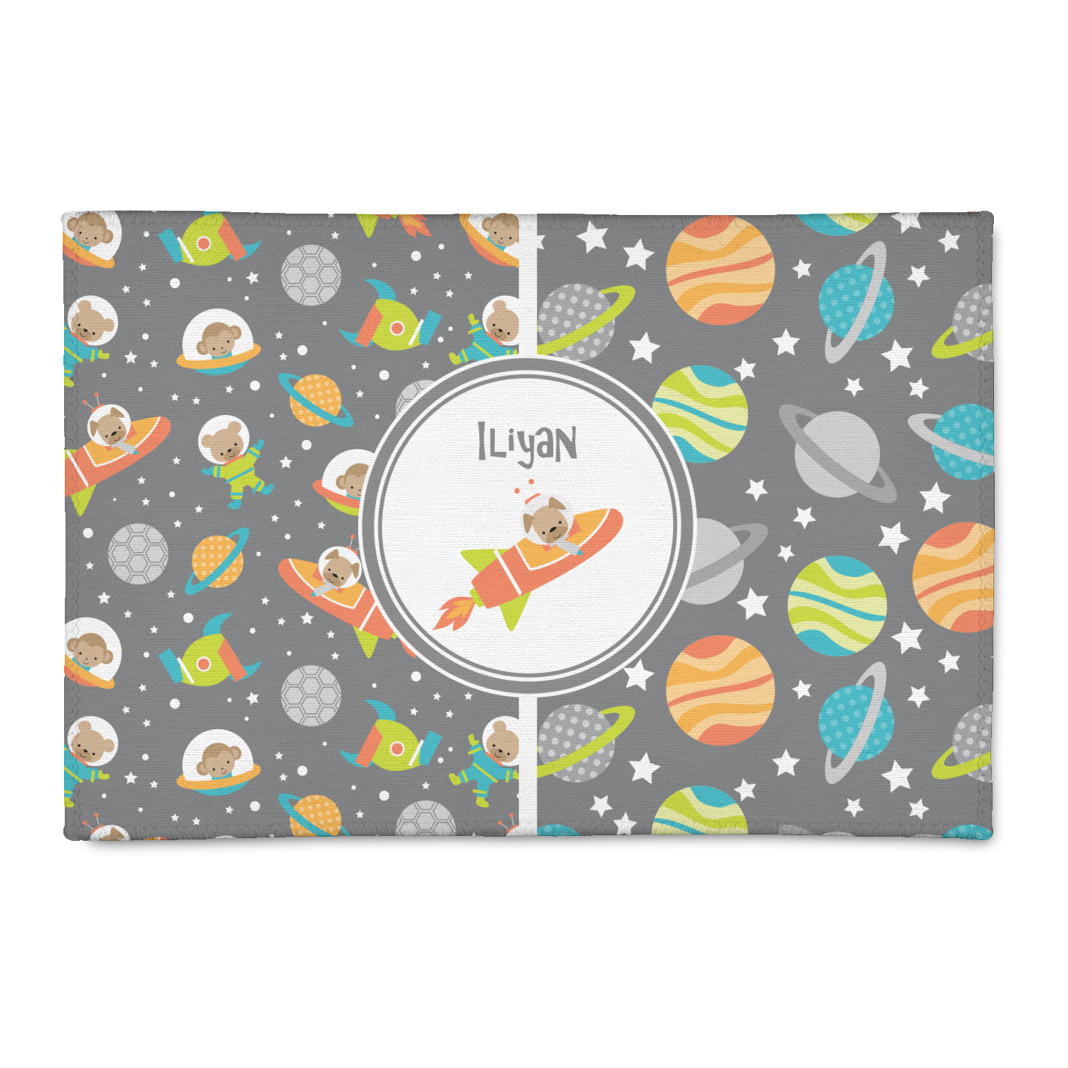 The design is filled with adorable little animal friends in space suits and space ships! On the other side, there are cute little coordinating planets! The bright colors on the animals and planets make for a great contrast to the dark grey background.