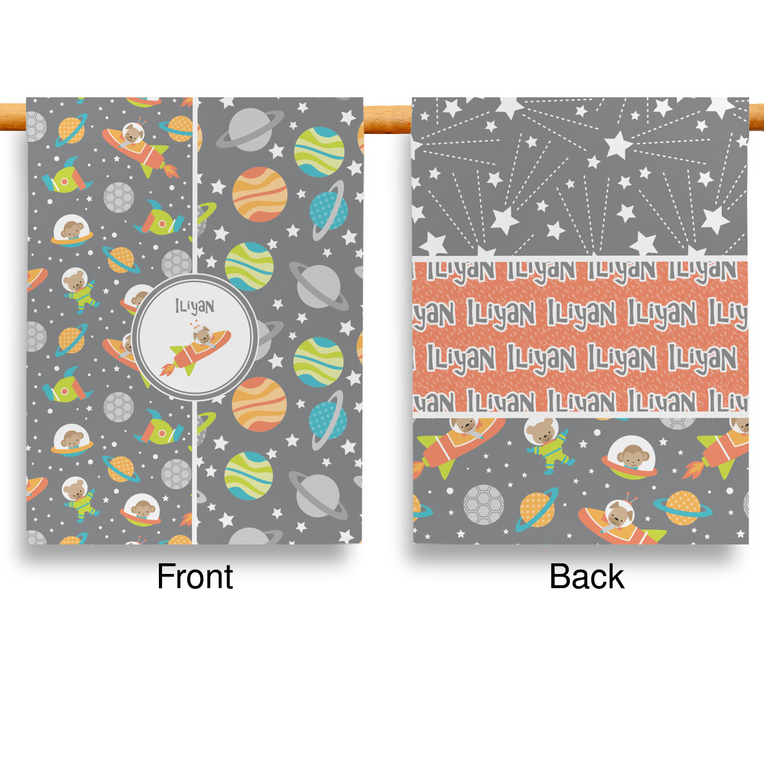 The design is filled with adorable little animal friends in space suits and space ships! On the other side, there are cute little coordinating planets! The bright colors on the animals and planets make for a great contrast to the dark grey background.