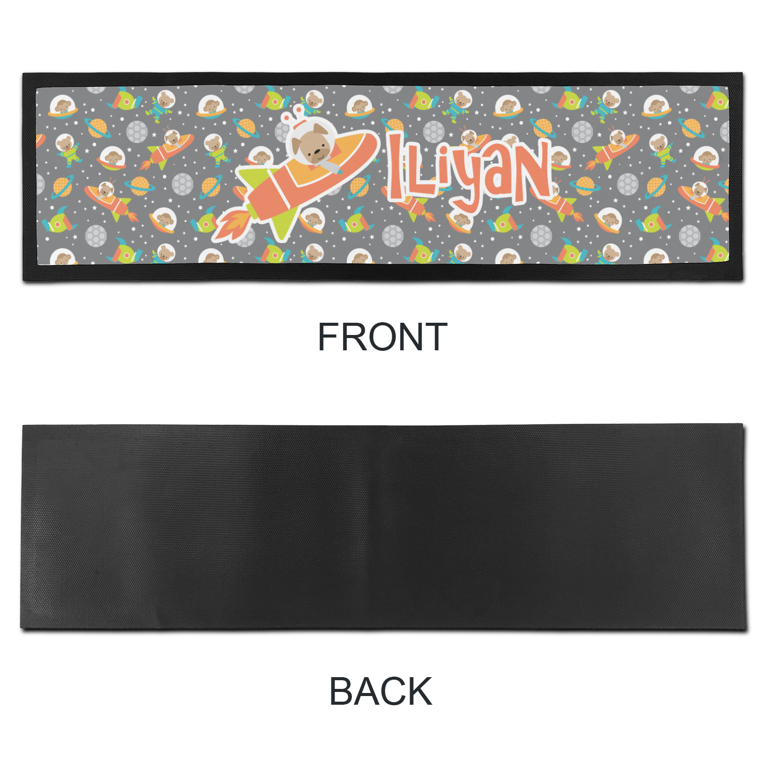 The design is filled with adorable little animal friends in space suits and space ships! On the other side, there are cute little coordinating planets! The bright colors on the animals and planets make for a great contrast to the dark grey background.