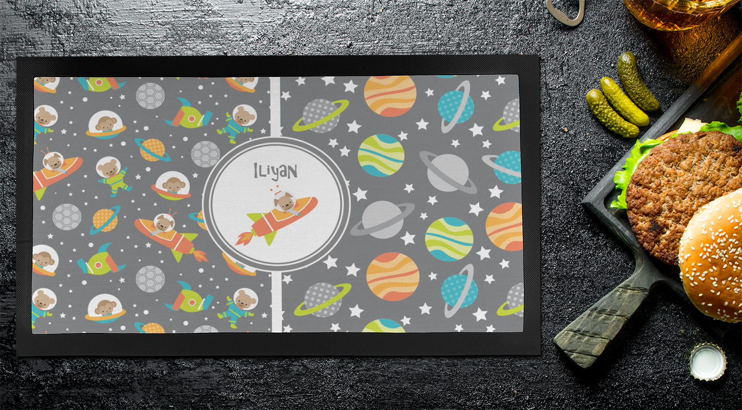 The design is filled with adorable little animal friends in space suits and space ships! On the other side, there are cute little coordinating planets! The bright colors on the animals and planets make for a great contrast to the dark grey background.