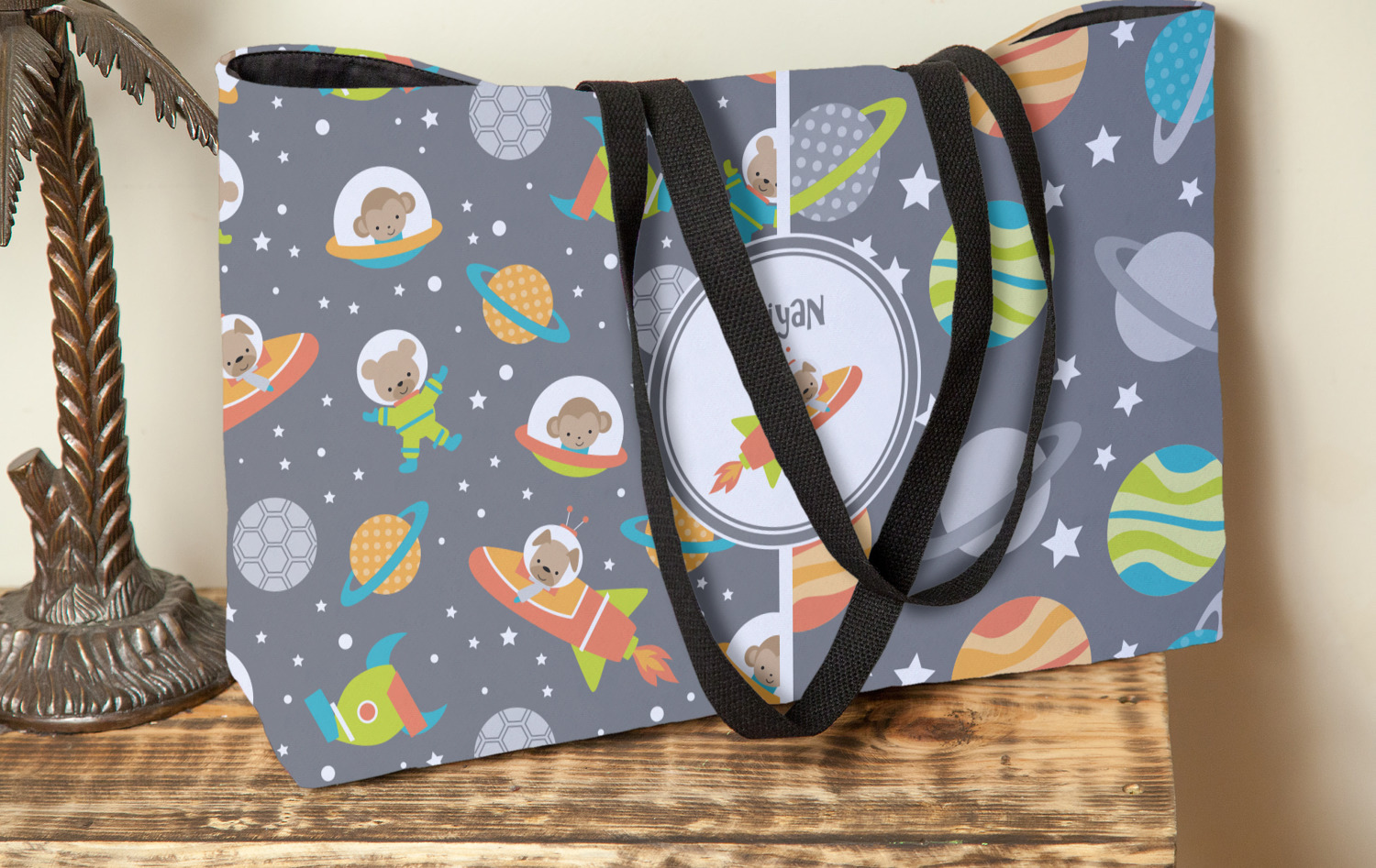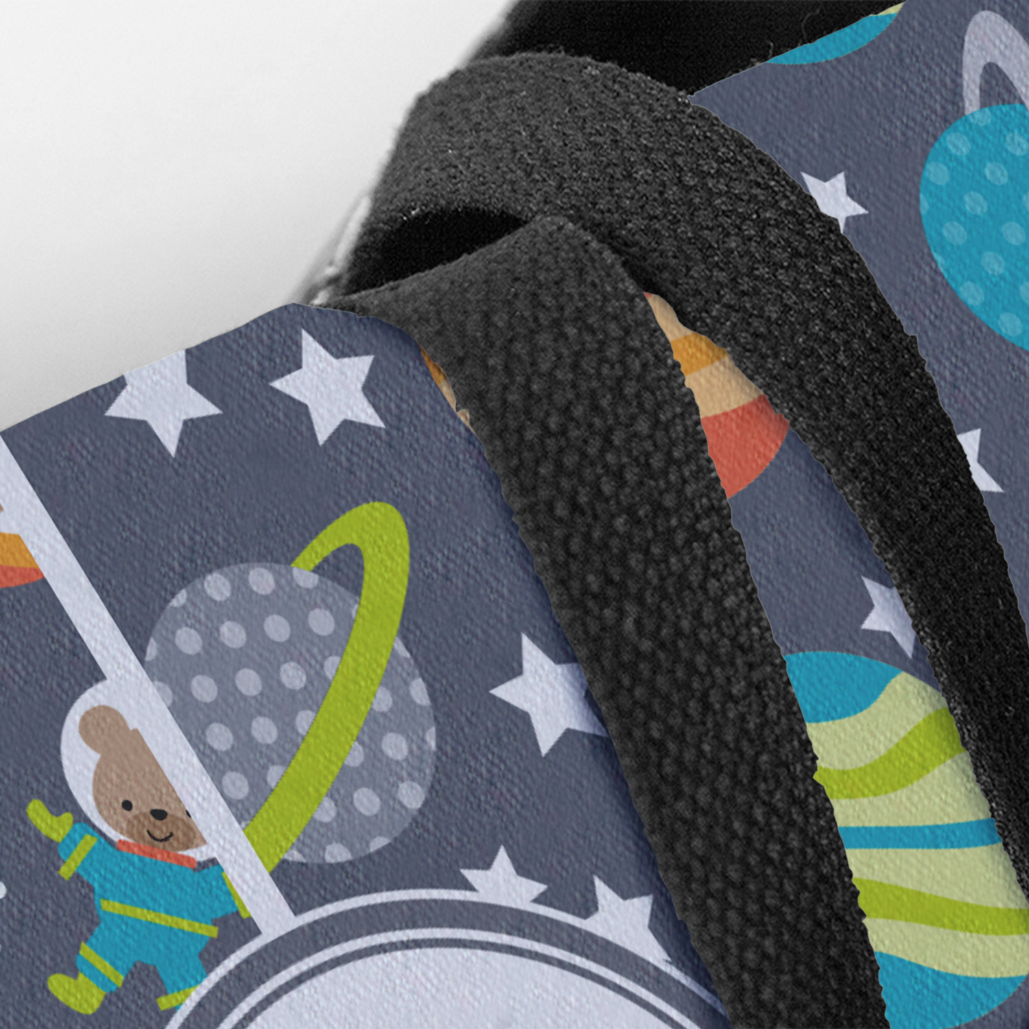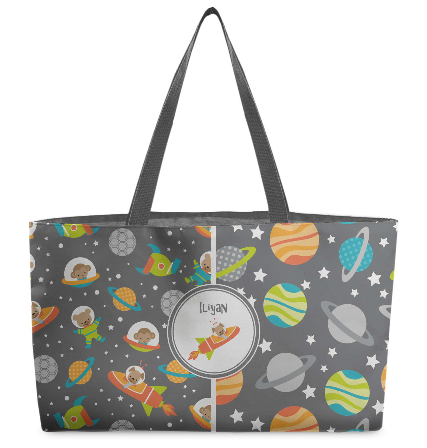 The design is filled with adorable little animal friends in space suits and space ships! On the other side, there are cute little coordinating planets! The bright colors on the animals and planets make for a great contrast to the dark grey background.