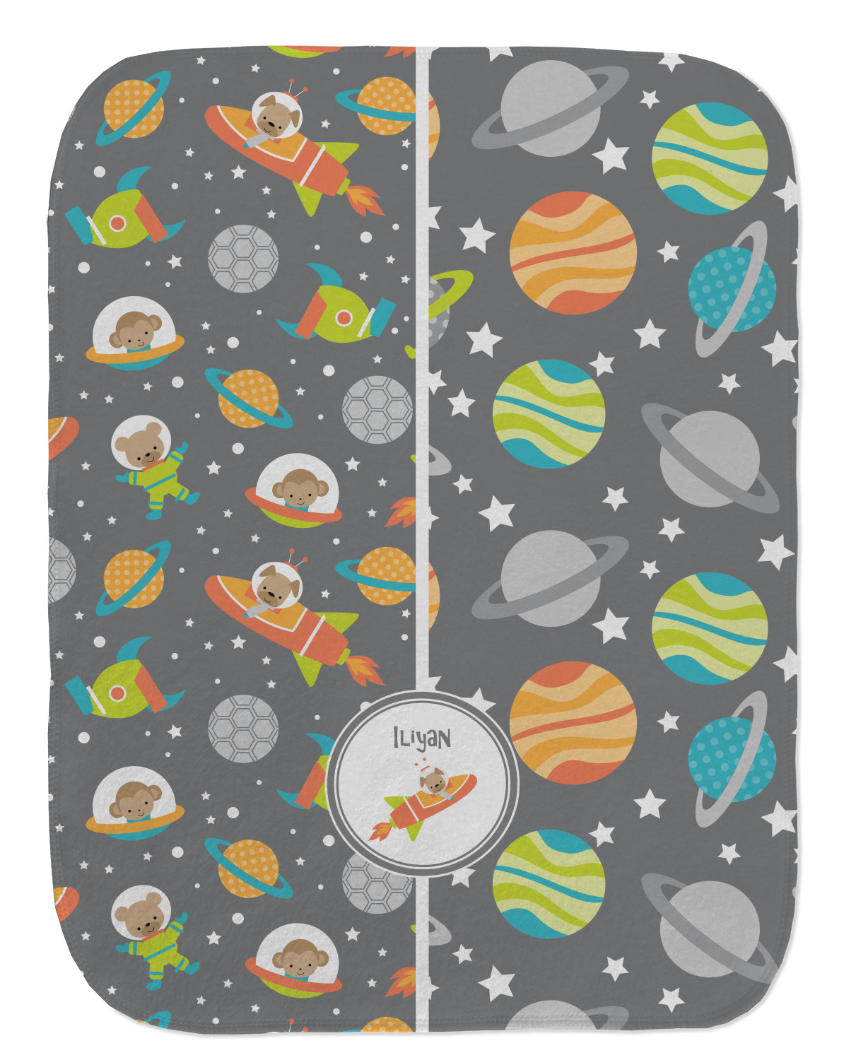 The design is filled with adorable little animal friends in space suits and space ships! On the other side, there are cute little coordinating planets! The bright colors on the animals and planets make for a great contrast to the dark grey background.