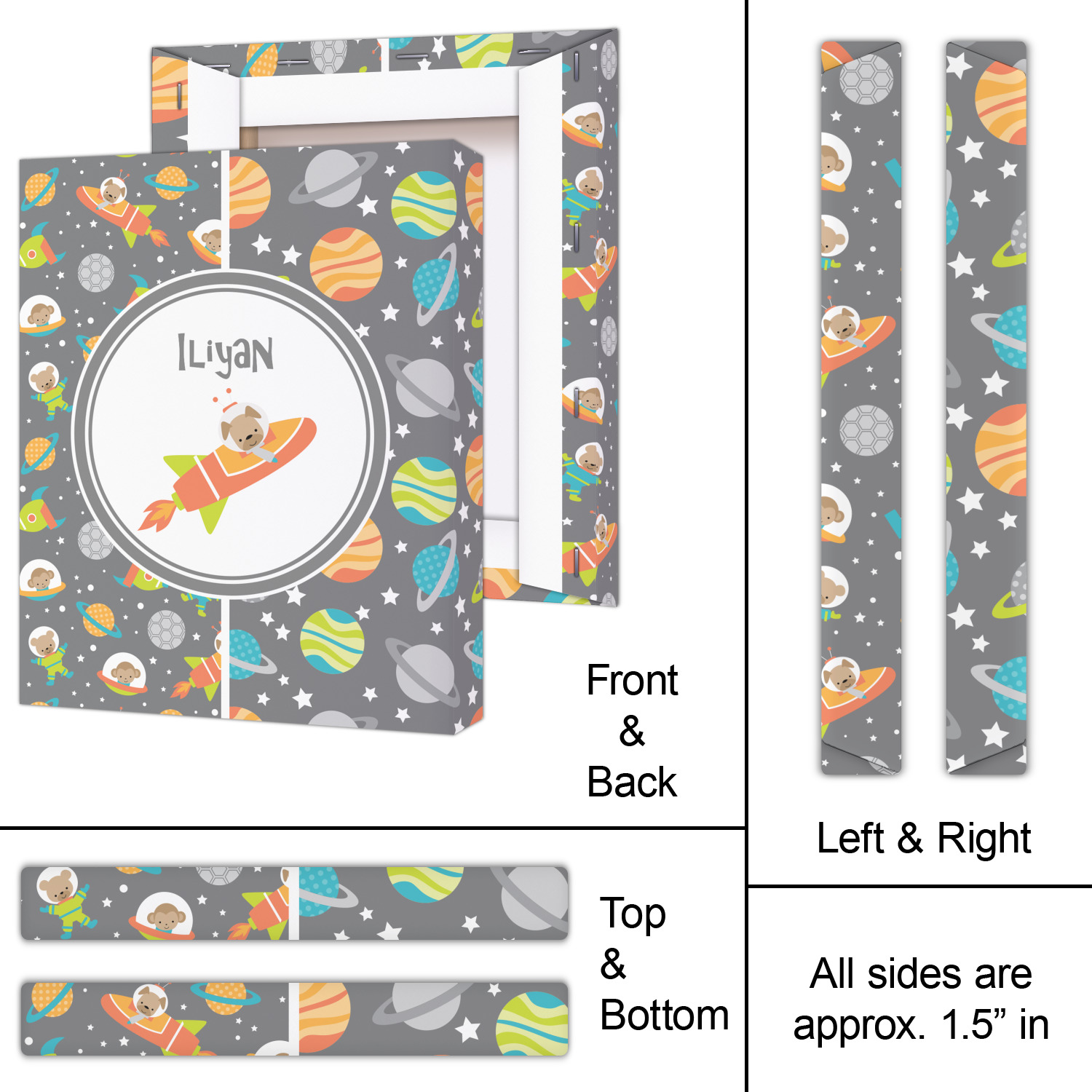 The design is filled with adorable little animal friends in space suits and space ships! On the other side, there are cute little coordinating planets! The bright colors on the animals and planets make for a great contrast to the dark grey background.
