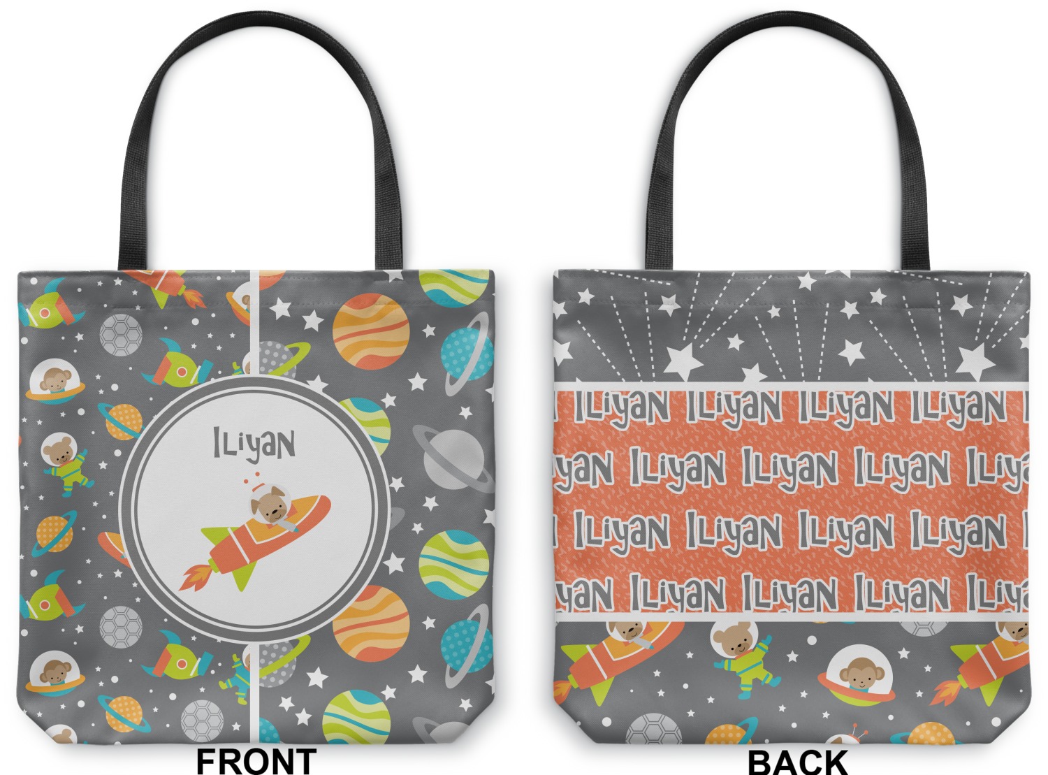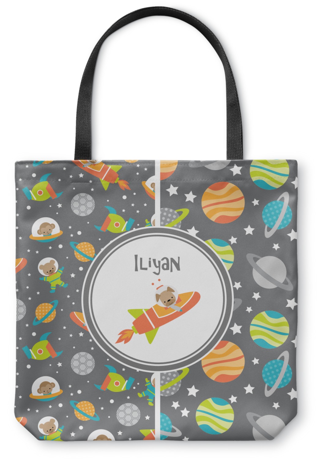 The design is filled with adorable little animal friends in space suits and space ships! On the other side, there are cute little coordinating planets! The bright colors on the animals and planets make for a great contrast to the dark grey background.