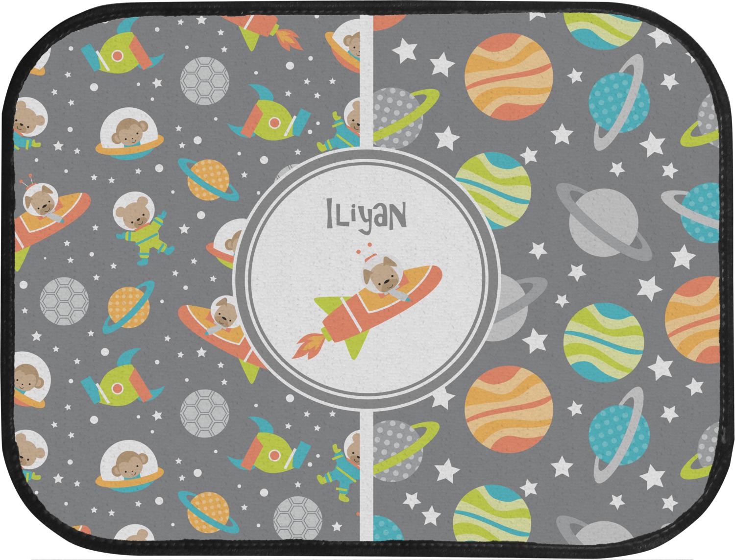 The design is filled with adorable little animal friends in space suits and space ships! On the other side, there are cute little coordinating planets! The bright colors on the animals and planets make for a great contrast to the dark grey background.