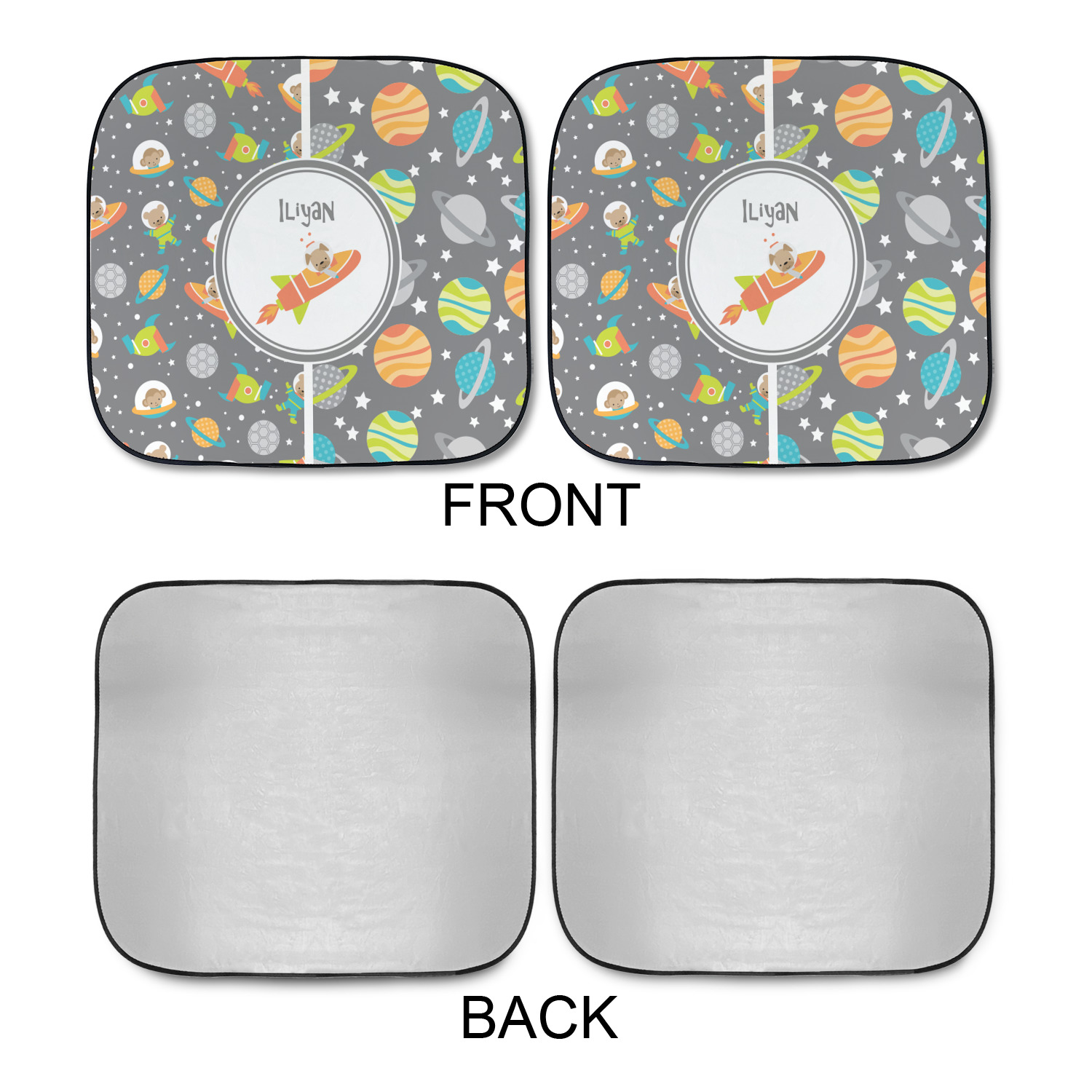 Sold as a pair and with your design printed on the front and the back having a reflective silver material these are sure to reduce the temperature of the inside of your car and keep UV rays from prematurely wearing your dash and interior panels. You have the option of both being the same design or design them separately for a unique look that will have all of your friends asking where you got your car windshield sun shades.
