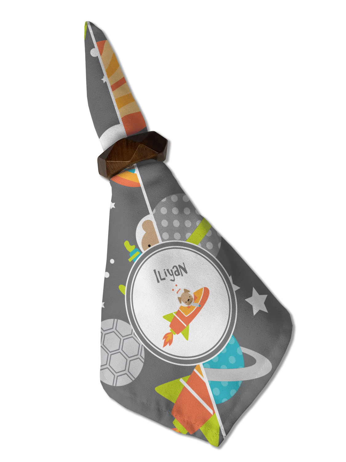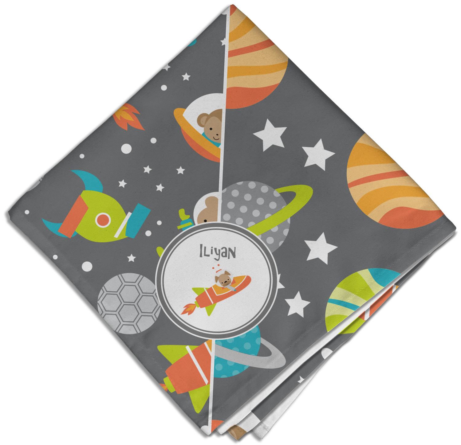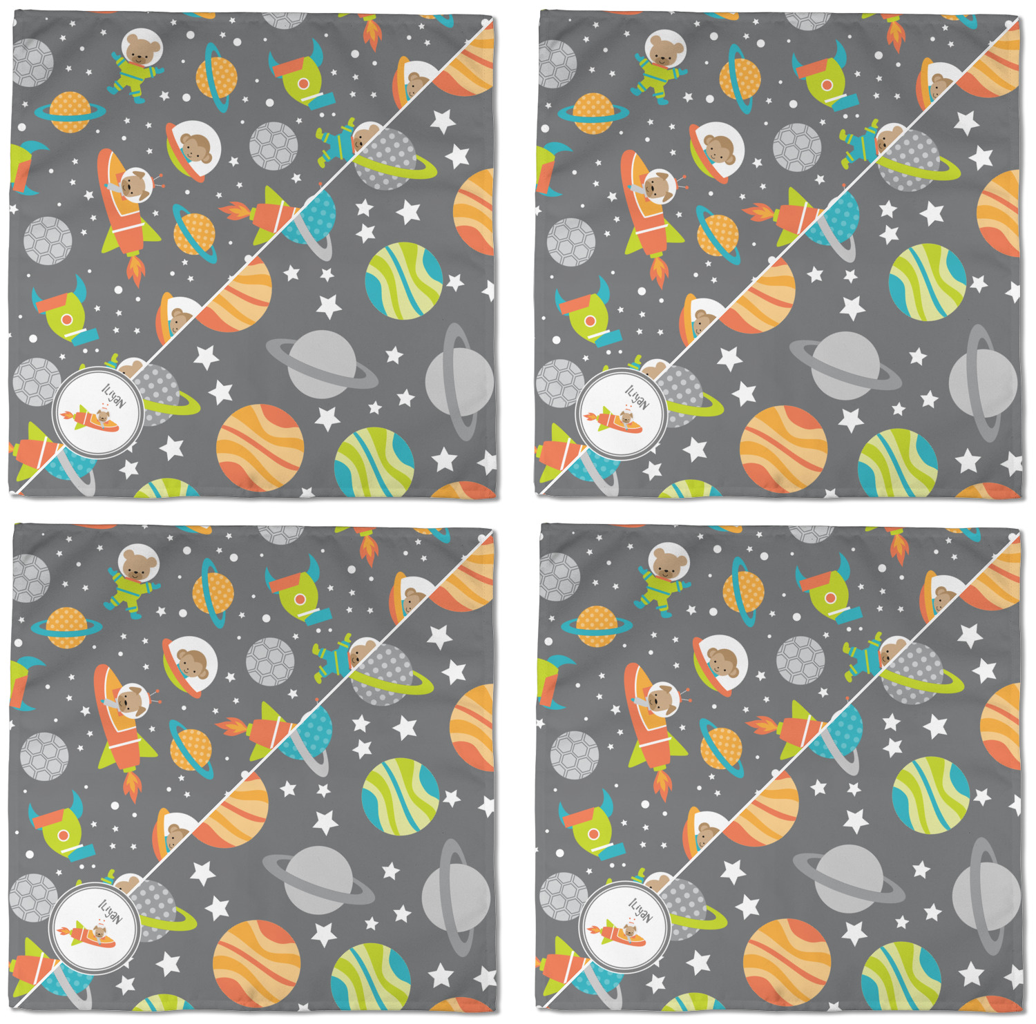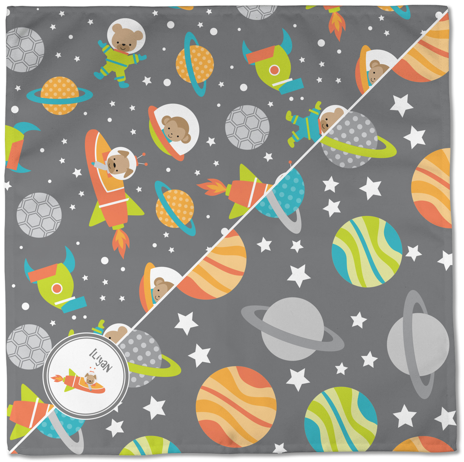 The design is filled with adorable little animal friends in space suits and space ships! On the other side, there are cute little coordinating planets! The bright colors on the animals and planets make for a great contrast to the dark grey background.