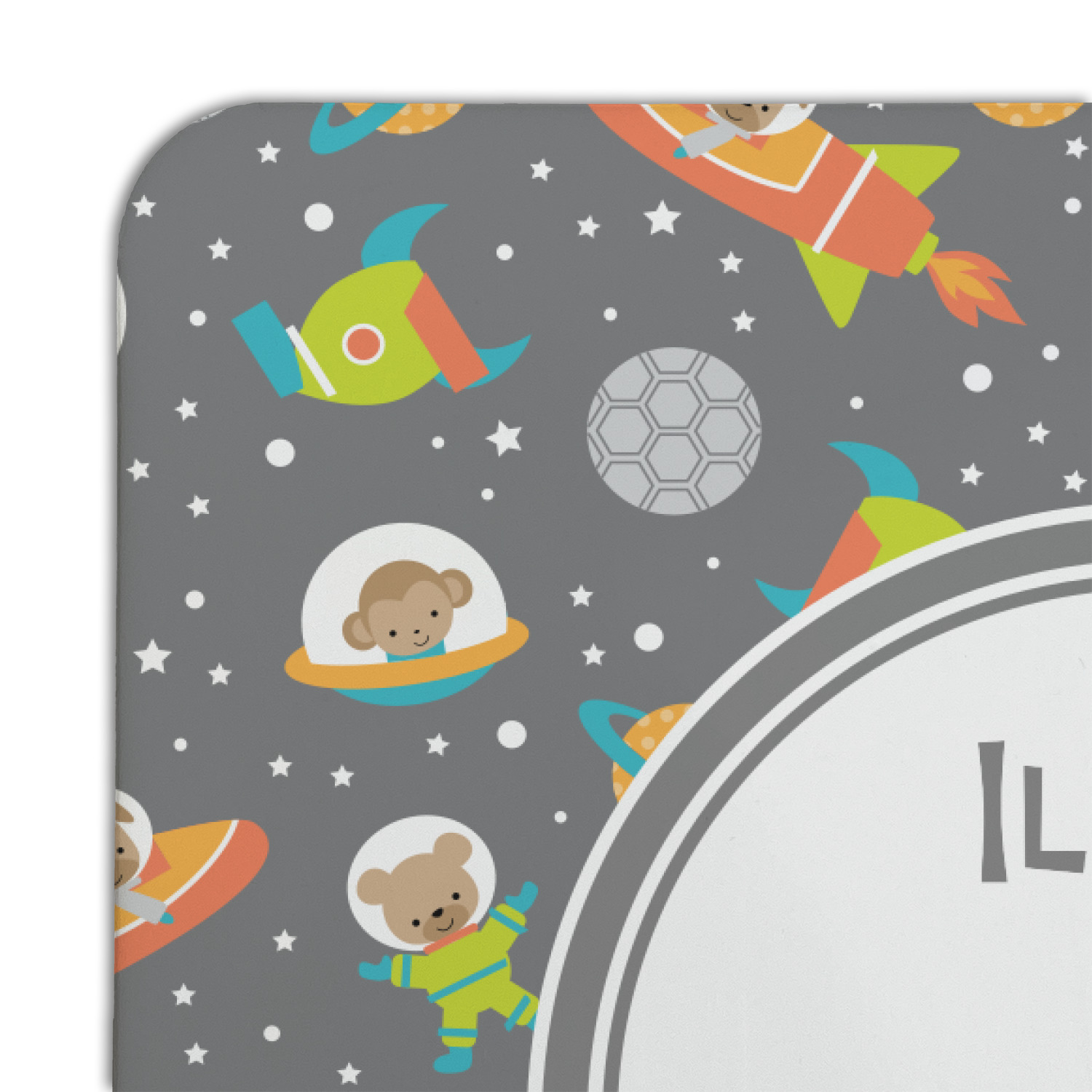 The design is filled with adorable little animal friends in space suits and space ships! On the other side, there are cute little coordinating planets! The bright colors on the animals and planets make for a great contrast to the dark grey background.