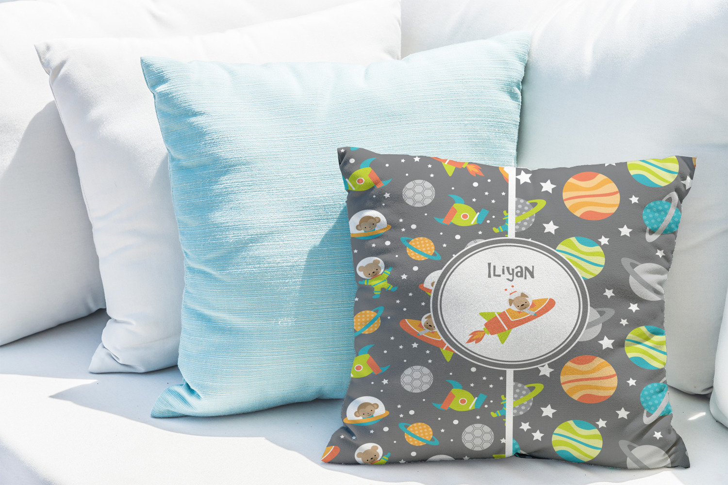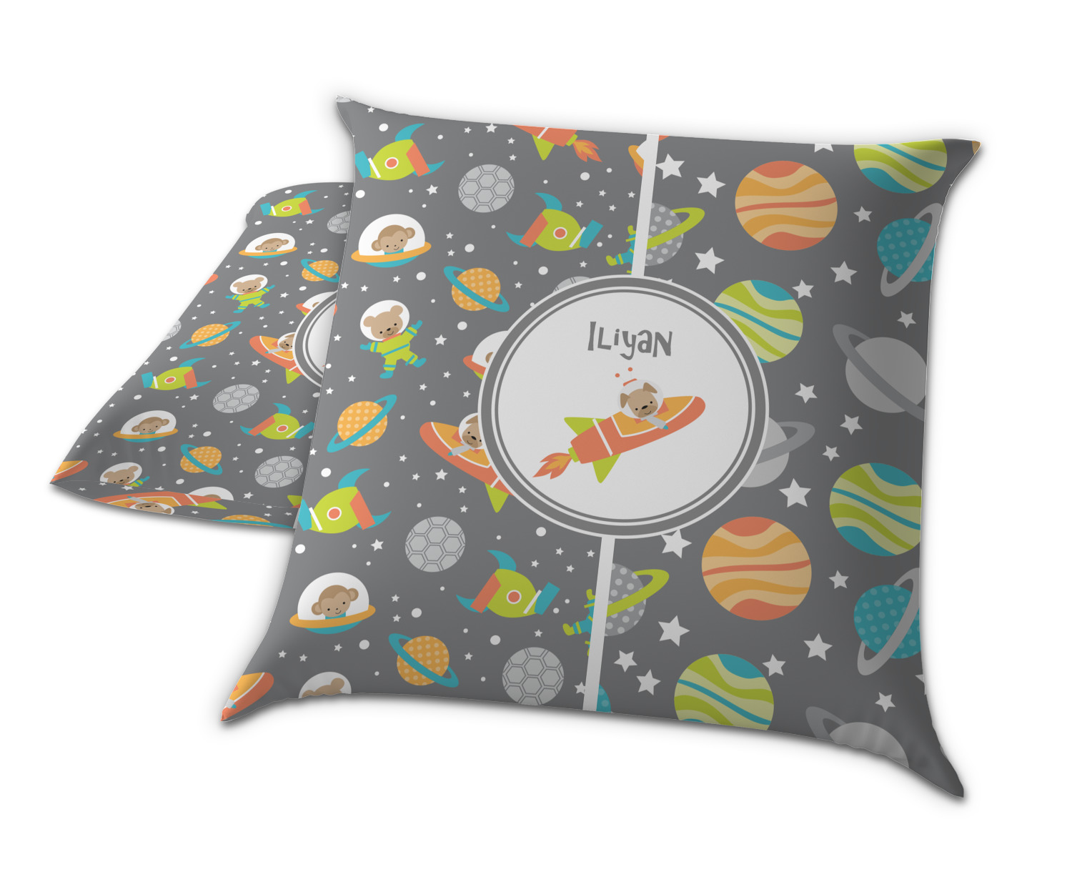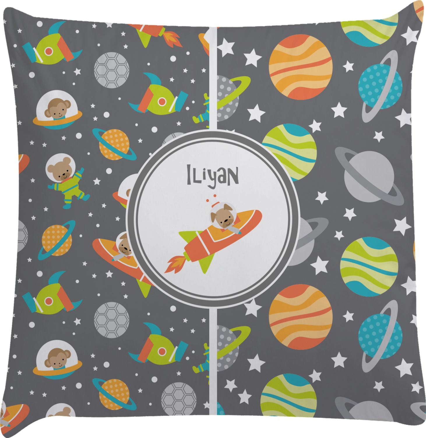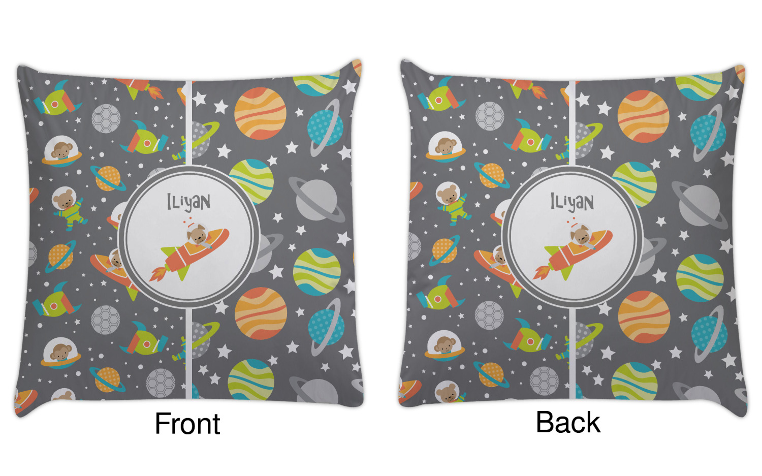 The design is filled with adorable little animal friends in space suits and space ships! On the other side, there are cute little coordinating planets! The bright colors on the animals and planets make for a great contrast to the dark grey background.
