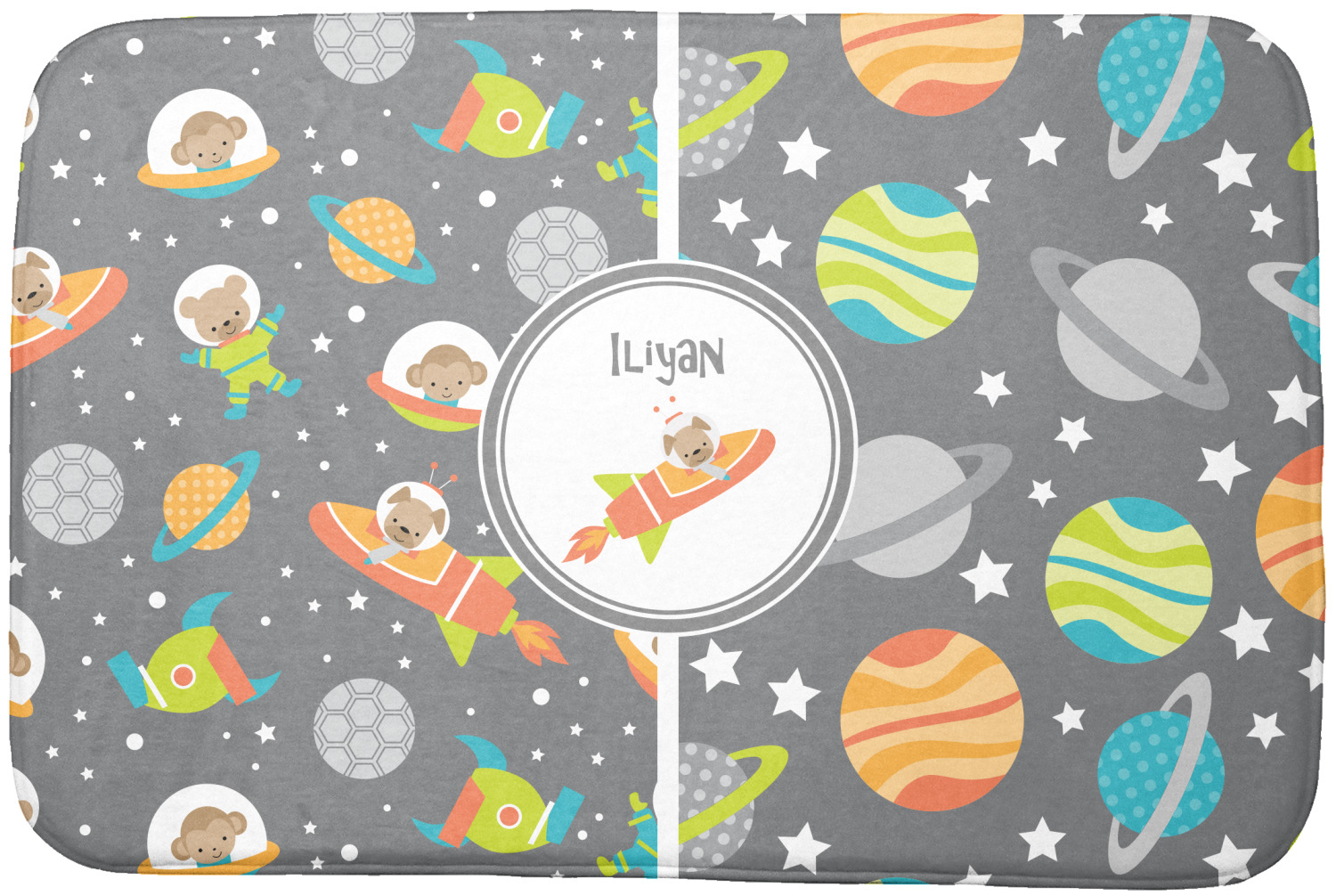 The design is filled with adorable little animal friends in space suits and space ships! On the other side, there are cute little coordinating planets! The bright colors on the animals and planets make for a great contrast to the dark grey background.
