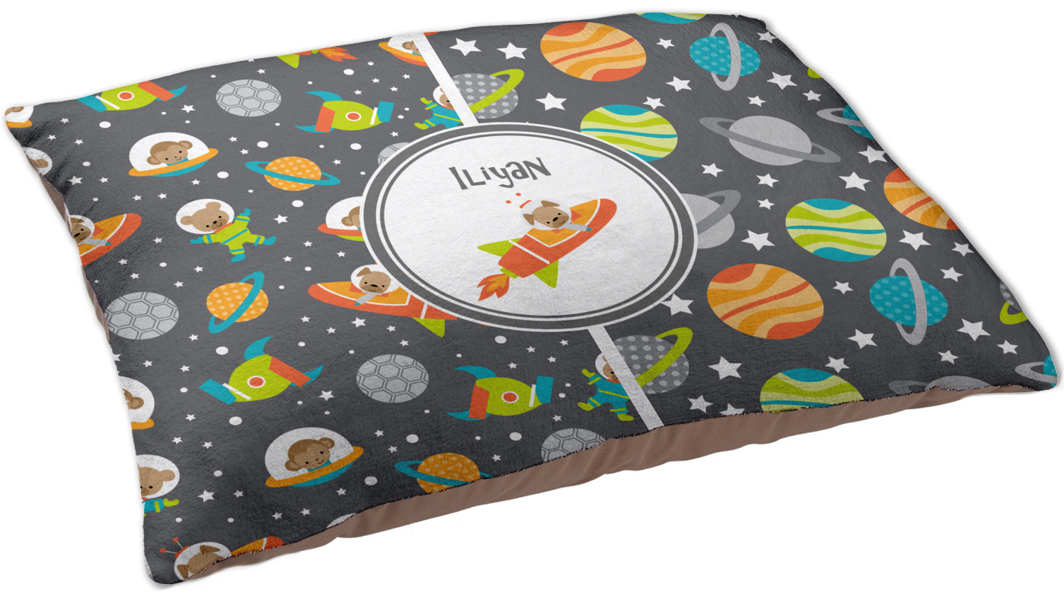 The design is filled with adorable little animal friends in space suits and space ships! On the other side, there are cute little coordinating planets! The bright colors on the animals and planets make for a great contrast to the dark grey background.