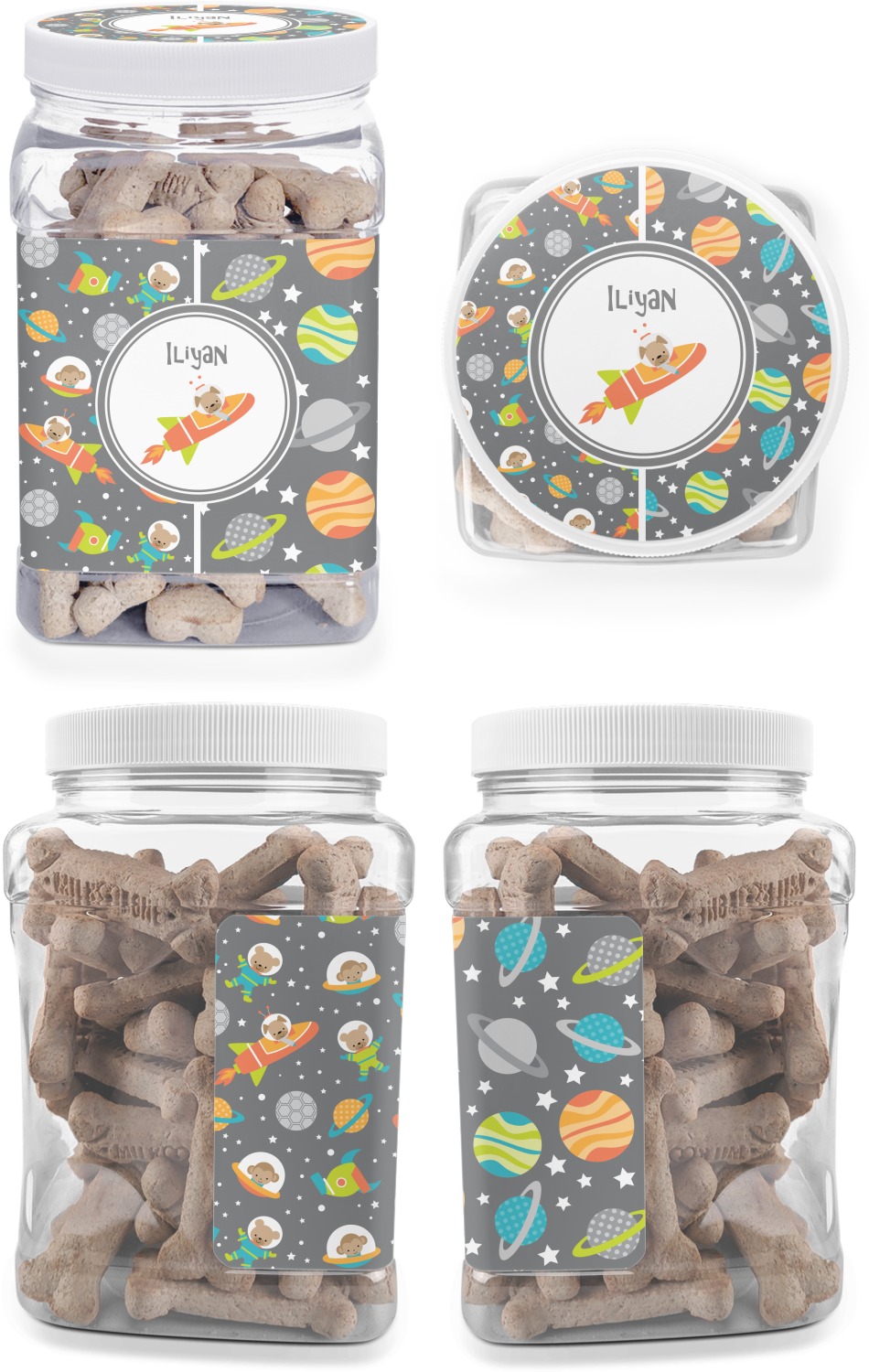 This half gallon jar, made from a sturdy plastic, is the perfect way to keep treats from any naughty pet paws, while still keeping them ready on hand for when your pup performs an impressive trick. This dog cookie jar features a screw-on, white lid that displays your personalized design on a vinyl sticker. We apply another customized sticker that wraps around the front and sides of the jar. Our dog treat jar also has indentations on the rear ends of the sides, which allows for convenient handling, and its square frame allows for easy storage.