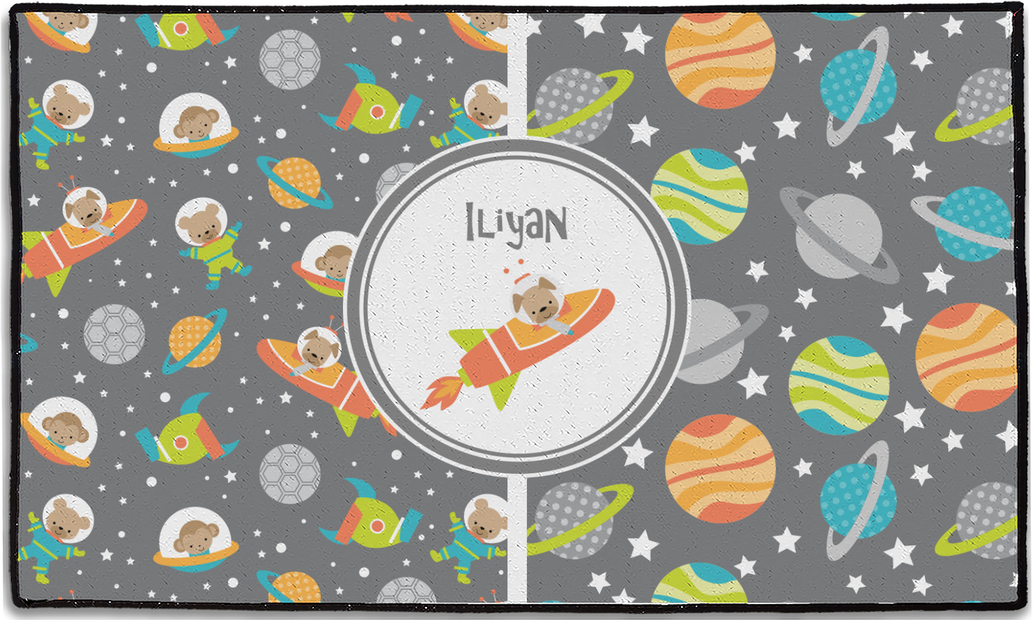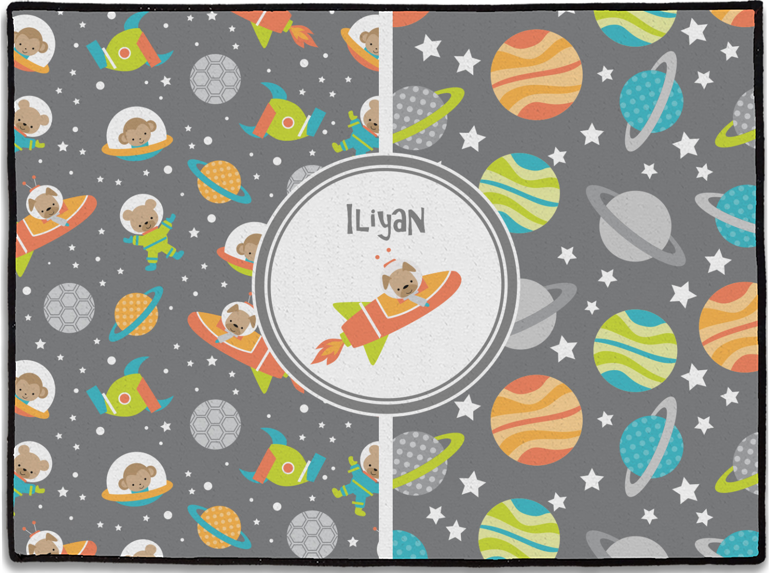 The design is filled with adorable little animal friends in space suits and space ships! On the other side, there are cute little coordinating planets! The bright colors on the animals and planets make for a great contrast to the dark grey background.