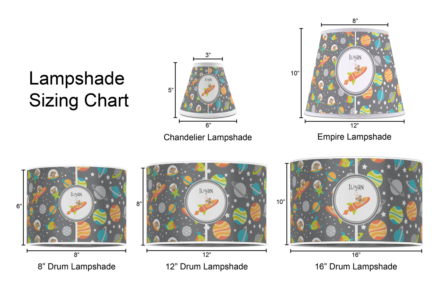 Our customized lamp shades also come in 3 different sizes: 8", 12" and 16", measuring at 8" in diameter by 6" tall, 12" in diameter by 8" tall, and 16" in diameter by 10" tall, respectively.