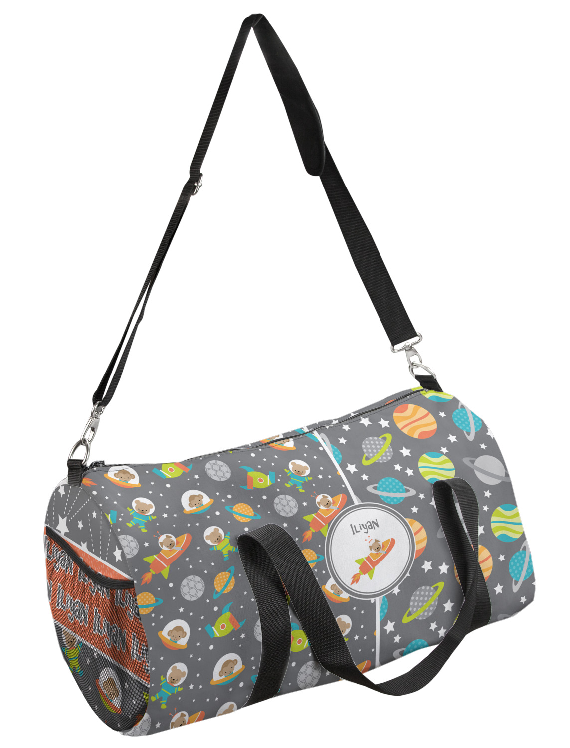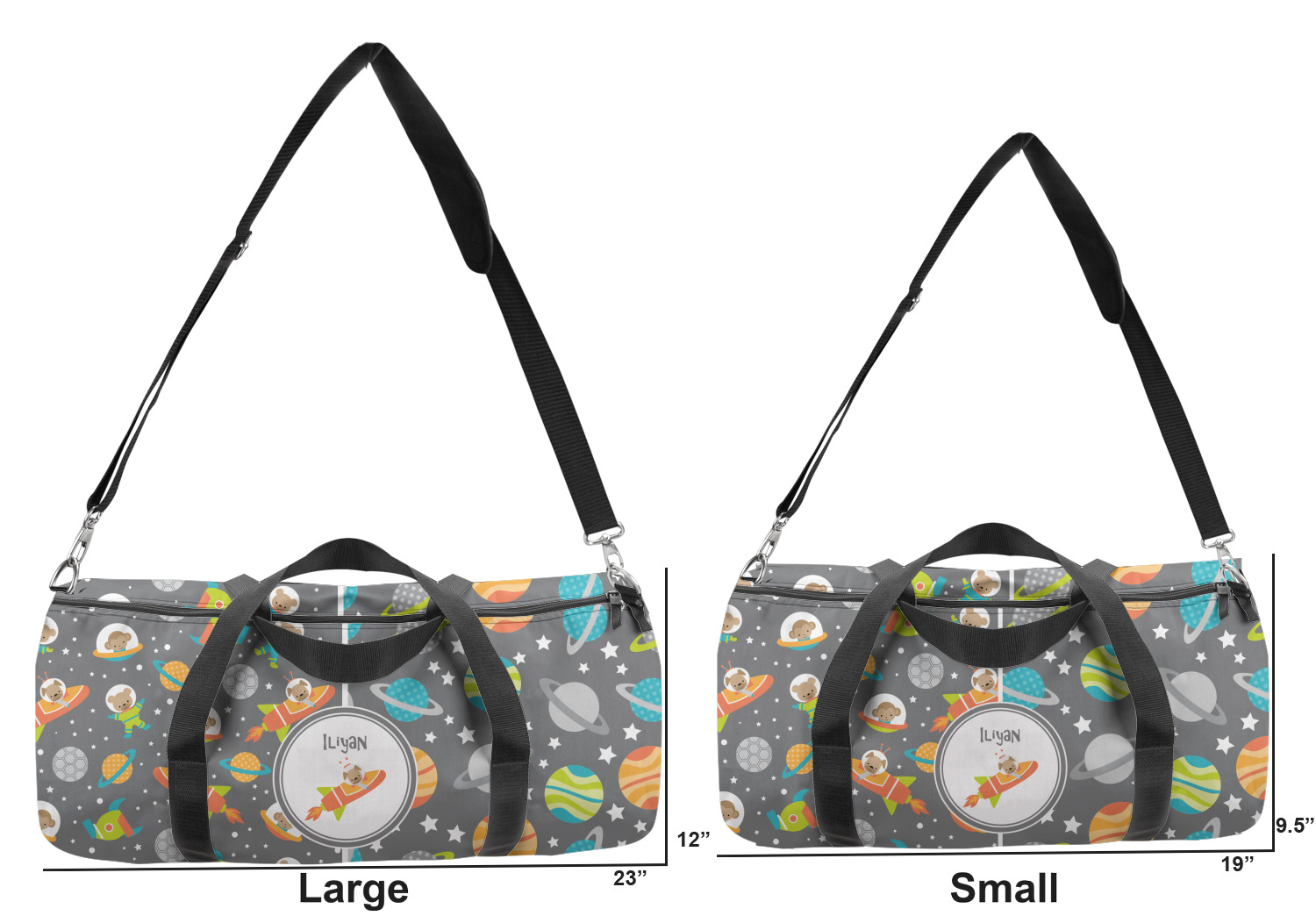 This duffle is a sturdy bag made of a canvas material. It comes in two sizes: Small (19"W x 9.5"H x 9.5"D) and Large (23"W x 12"H x 12"D). The bag is a cylindrical shape with a black adjustable strap and two handles. On one side is an elastic pouch to put a waterbottle or other small item. Your product will be sublimated with your design and is able to be designed on the front, back, and sides. Be sure to remember that the straps may cut into parts of your design if you upload your own artwork.