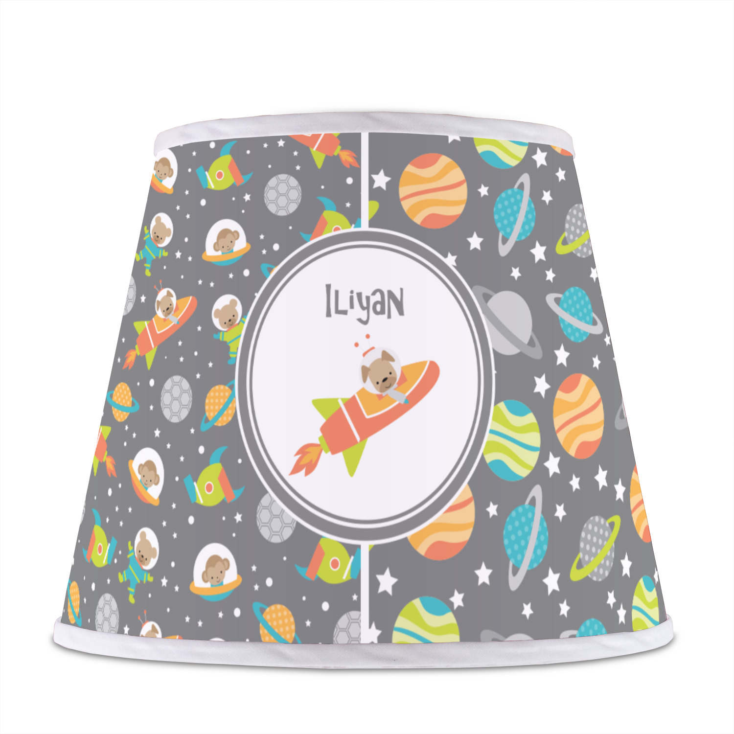 The design is filled with adorable little animal friends in space suits and space ships! On the other side, there are cute little coordinating planets! The bright colors on the animals and planets make for a great contrast to the dark grey background.