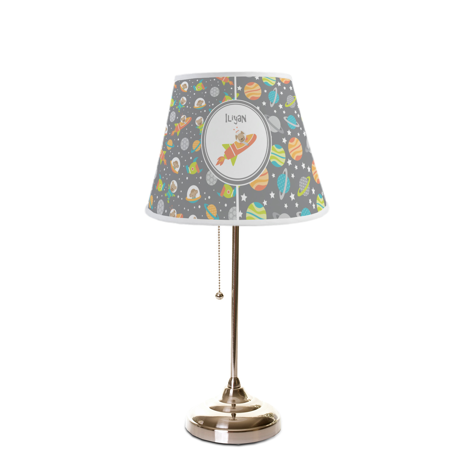 The base of this lampshade is 12 inches in diameter, and the top spans 8 inches in diameter. The total height of the lampshade is 10 inches. The angled nature of this custom lampshade concentrates the light, making it ideal for smaller spaces. This lampshade is made of matte, polyfilm, and displays your customization in its middle. The top and bottom of this colorful lamp shade are lined with a white fabric ribbon (which can be replaced with black inside the design studio) which frames your design and creates a sophisticated finish. As an UNO fitter lampshade, this unique lamp shade will fit a variety of bases.