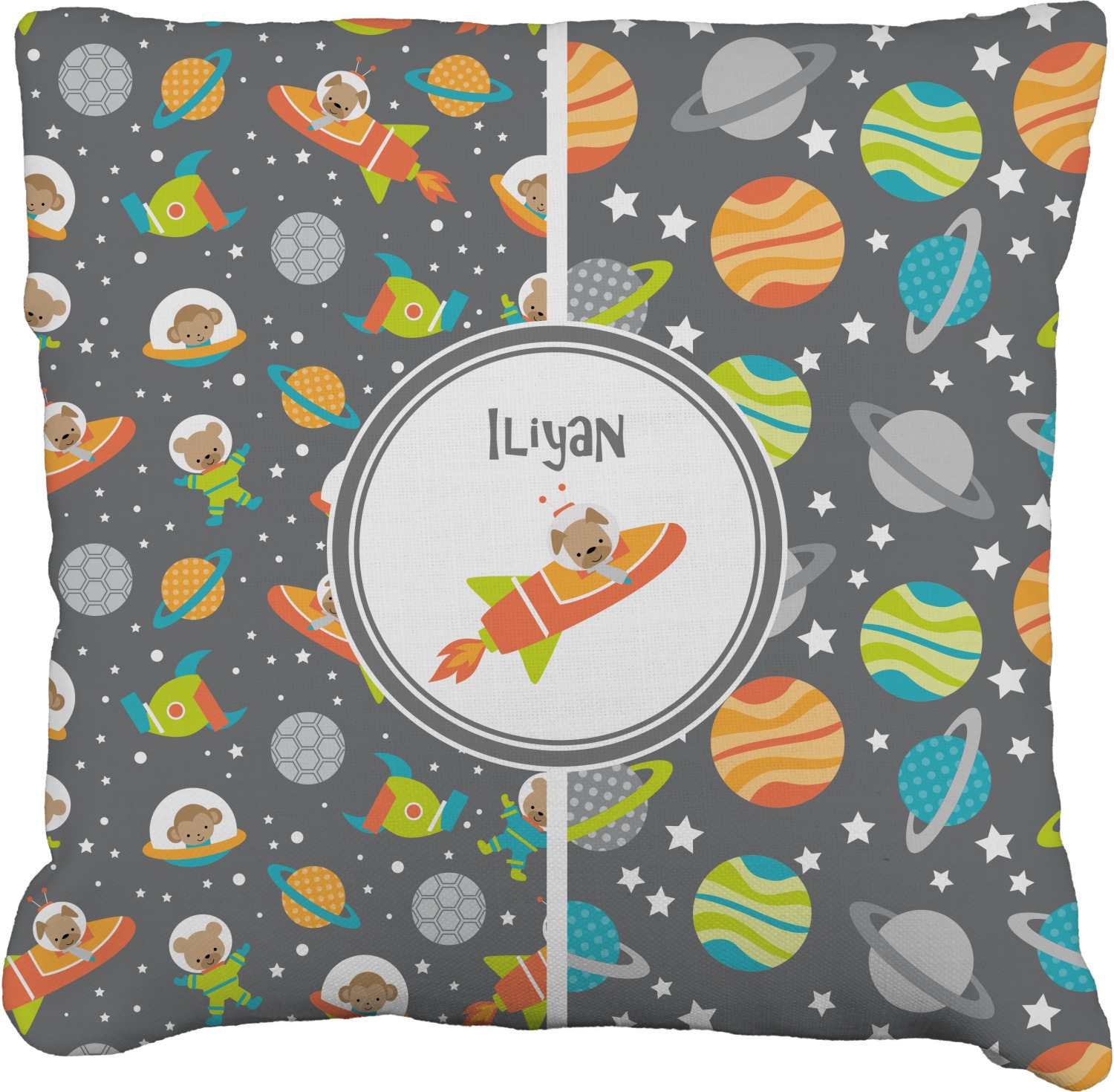 The design is filled with adorable little animal friends in space suits and space ships! On the other side, there are cute little coordinating planets! The bright colors on the animals and planets make for a great contrast to the dark grey background.