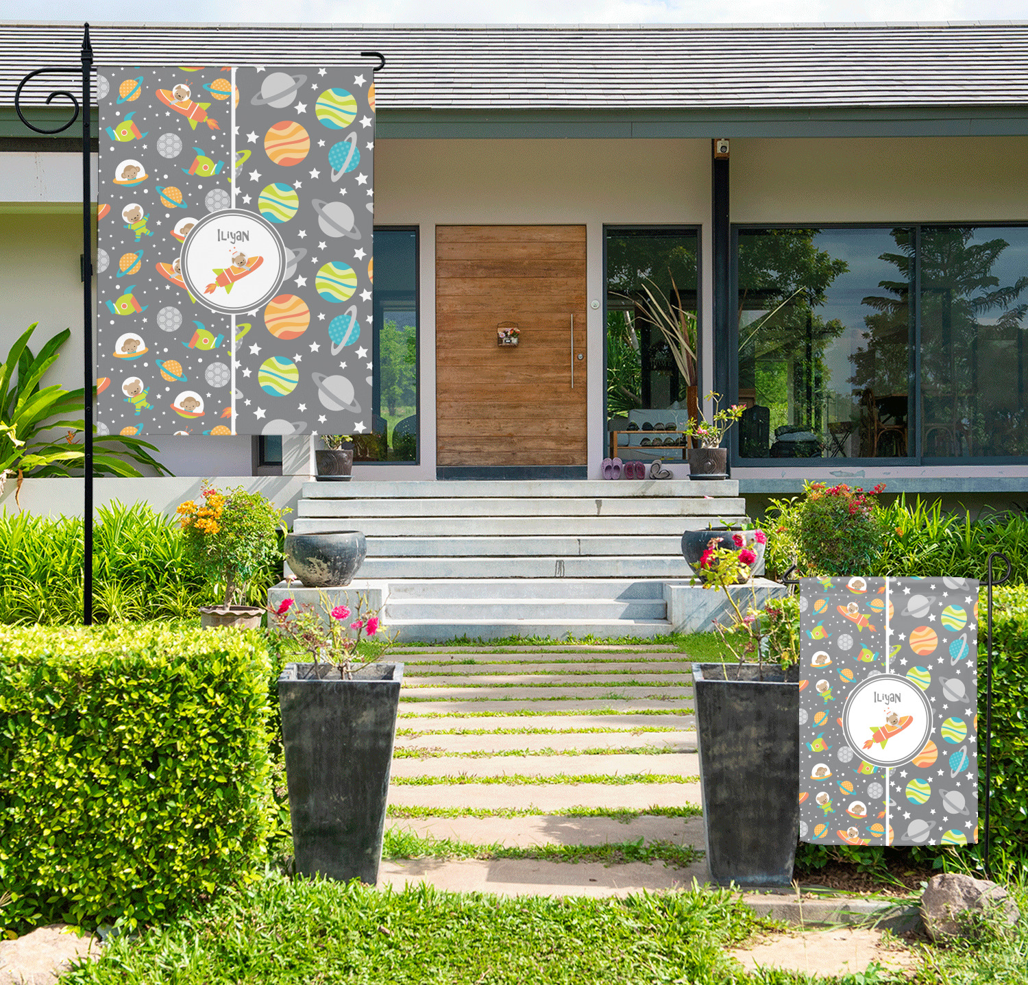 These custom garden flags are made of a durable, double-ply, polyester weave, allowing them to withstand the elements year round. The small flags measure at approximately 12 by 18 inches. The large flags measure out to 28 by 37 inches. You can order these decorative flags with your customization printed on the front only, or the front and back.
