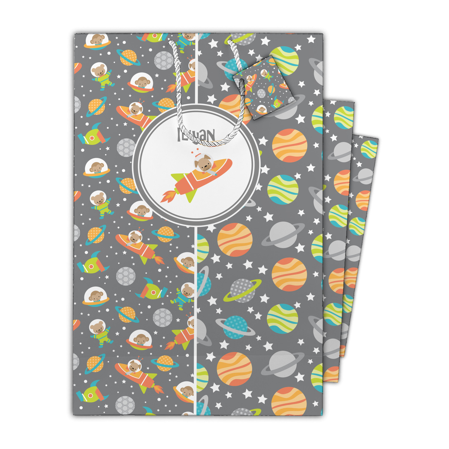 The design is filled with adorable little animal friends in space suits and space ships! On the other side, there are cute little coordinating planets! The bright colors on the animals and planets make for a great contrast to the dark grey background.