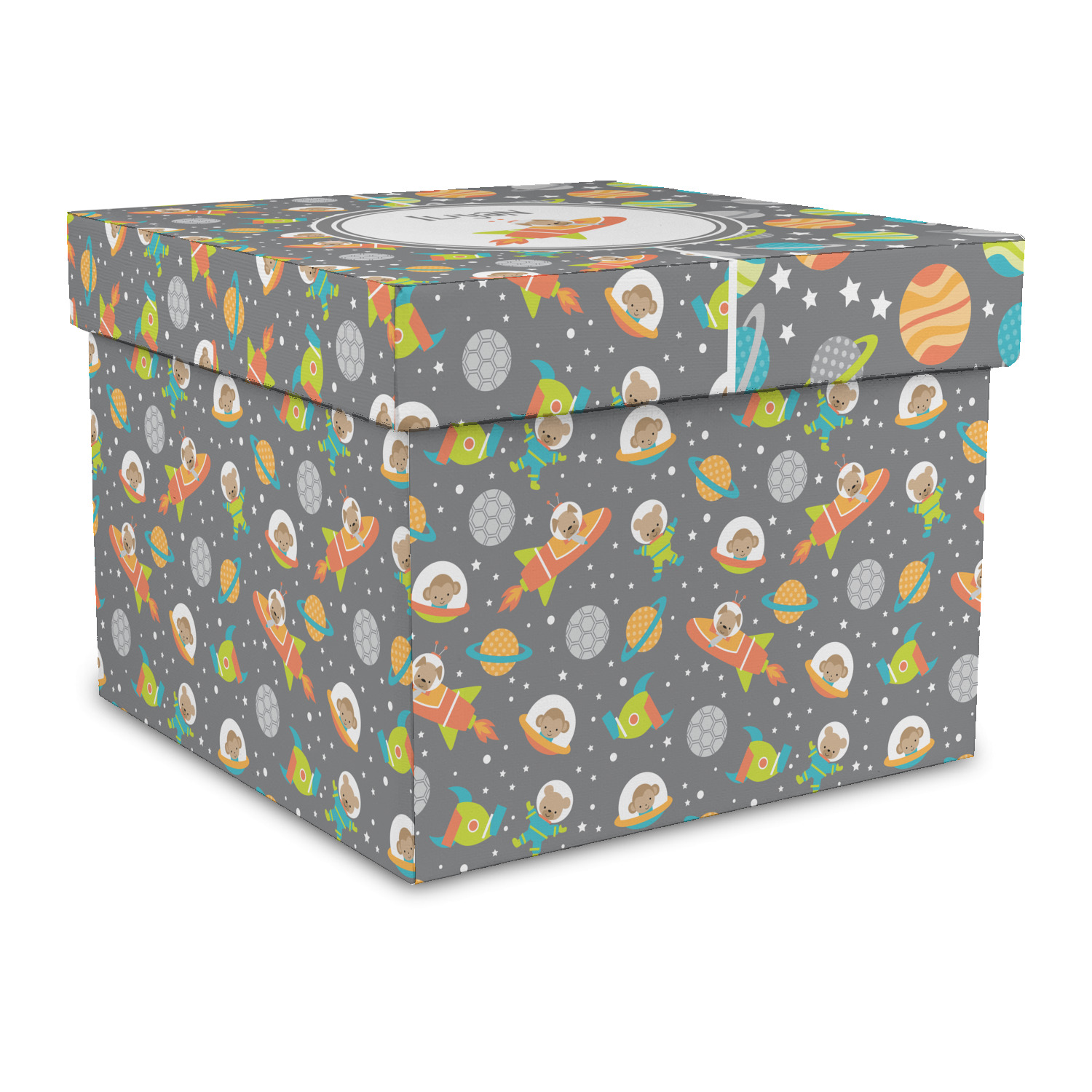 The design is filled with adorable little animal friends in space suits and space ships! On the other side, there are cute little coordinating planets! The bright colors on the animals and planets make for a great contrast to the dark grey background.