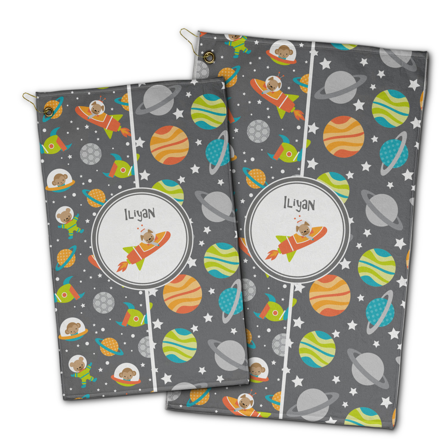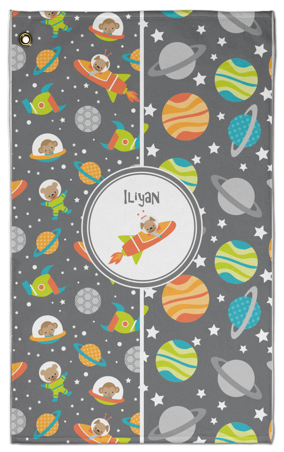 The design is filled with adorable little animal friends in space suits and space ships! On the other side, there are cute little coordinating planets! The bright colors on the animals and planets make for a great contrast to the dark grey background.