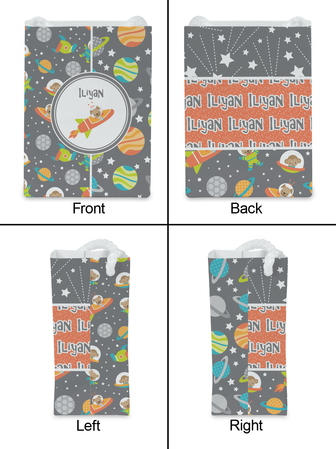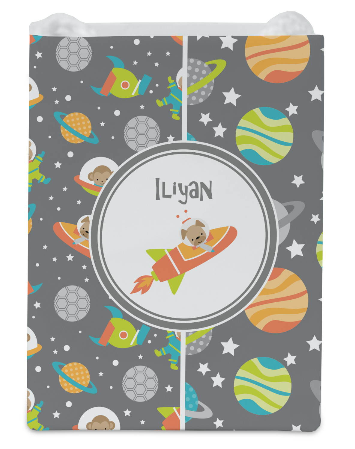 The design is filled with adorable little animal friends in space suits and space ships! On the other side, there are cute little coordinating planets! The bright colors on the animals and planets make for a great contrast to the dark grey background.