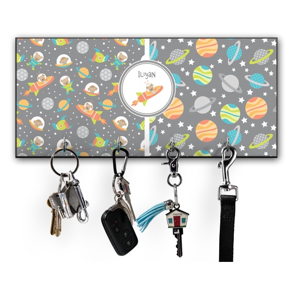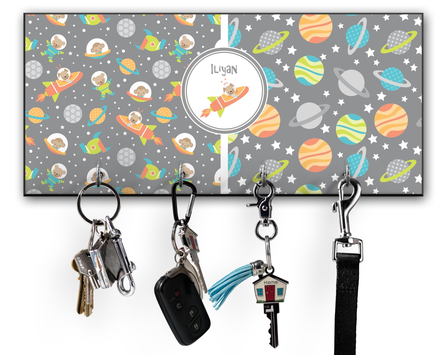 This 11" x 5" key hanger is made of sturdy wood and has four metal hooks lining the bottom. This is the perfect size for a family with several drivers. Not only can you hang keys on it though, but pet leashes and other small items. The board is black on the sides and back and is printed with the design of your choice on the front.