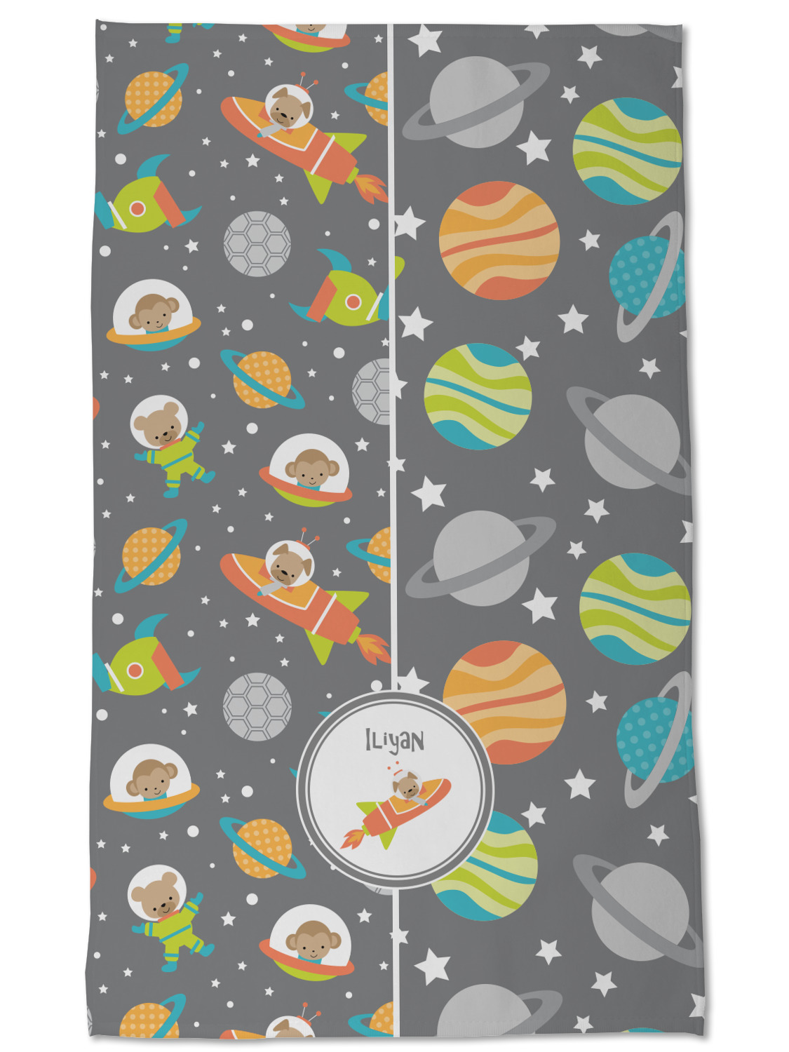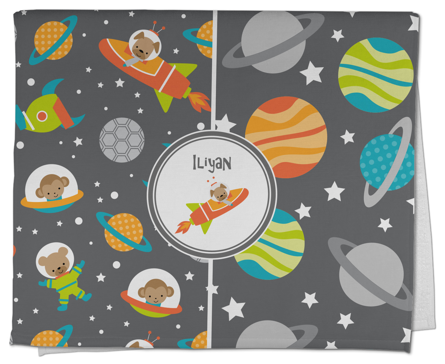 The design is filled with adorable little animal friends in space suits and space ships! On the other side, there are cute little coordinating planets! The bright colors on the animals and planets make for a great contrast to the dark grey background.