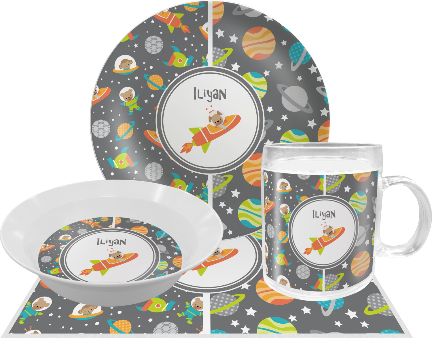 The design is filled with adorable little animal friends in space suits and space ships! On the other side, there are cute little coordinating planets! The bright colors on the animals and planets make for a great contrast to the dark grey background.
