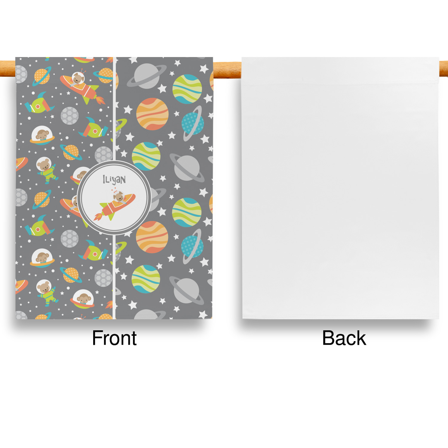 These custom garden flags are made of a durable, double-ply, polyester weave, allowing them to withstand the elements year round. The small flags measure at approximately 12 by 18 inches. The large flags measure out to 28 by 37 inches. You can order these decorative flags with your customization printed on the front only, or the front and back.