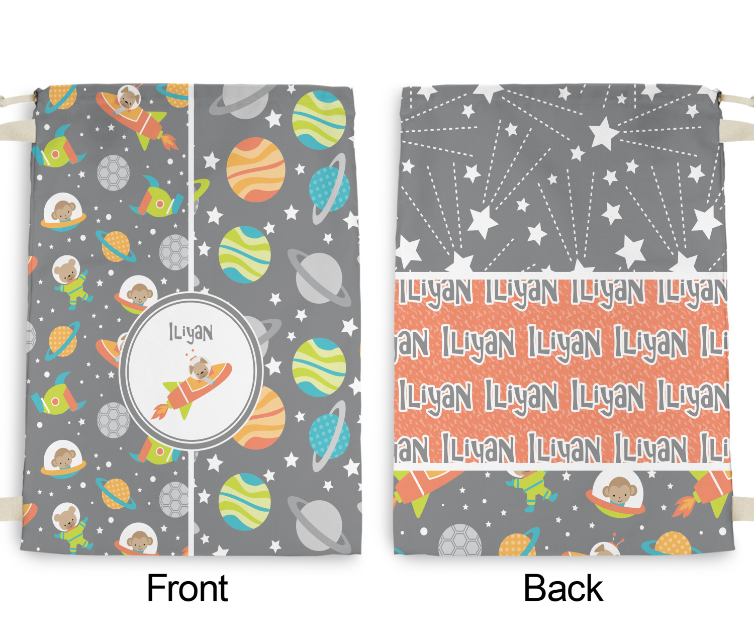 The design is filled with adorable little animal friends in space suits and space ships! On the other side, there are cute little coordinating planets! The bright colors on the animals and planets make for a great contrast to the dark grey background.