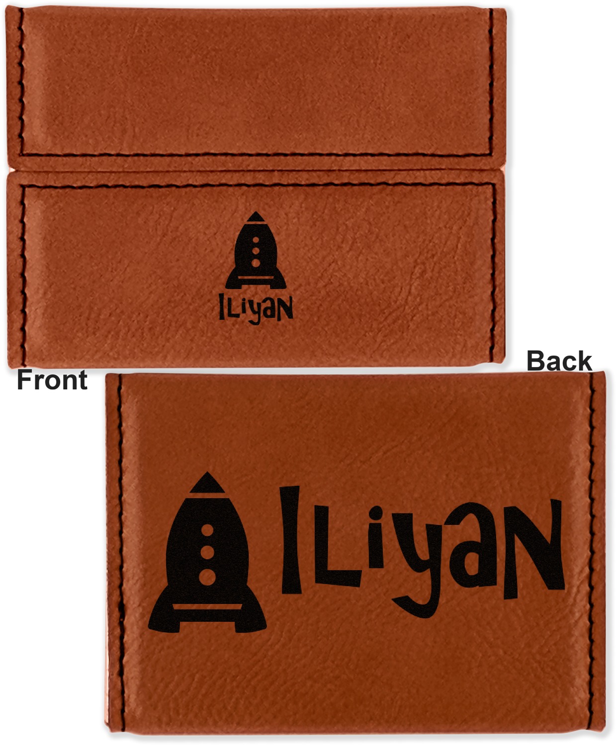 Your personalized design is laser engraved onto either the front, or the front and back of the card holder, depending on the model you purchase. Once engraved, the design will appear a darkened black against the cognac color of the leatherette.