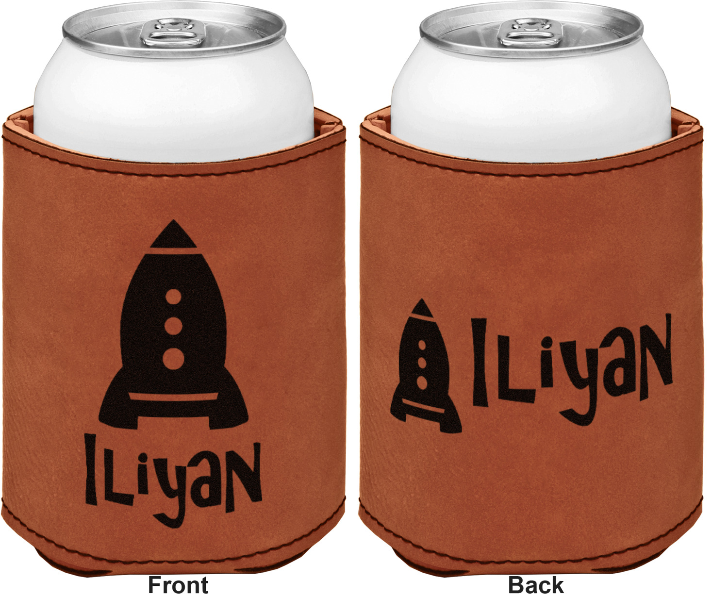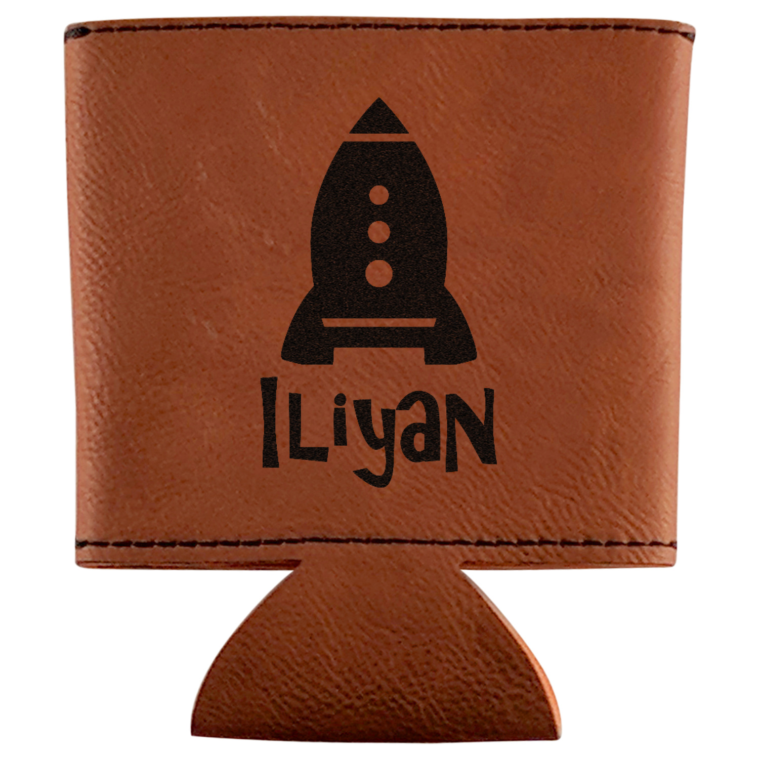 This can sleeve is made from a cognac-brown leatherette and stitched with a sturdy, black thread. A slim padding lines the inside of your can sleeve to allow for a better fit once your drink is inserted. The sleeve itself measures at 4 by 4.5 inches, allowing this custom can sleeve to accommodate most canned drinks. Your personalized design can be engraved on the front and back, or solely the front. When laser-engraved, your design appears as a black coloration which contrasts the leatherette nicely.