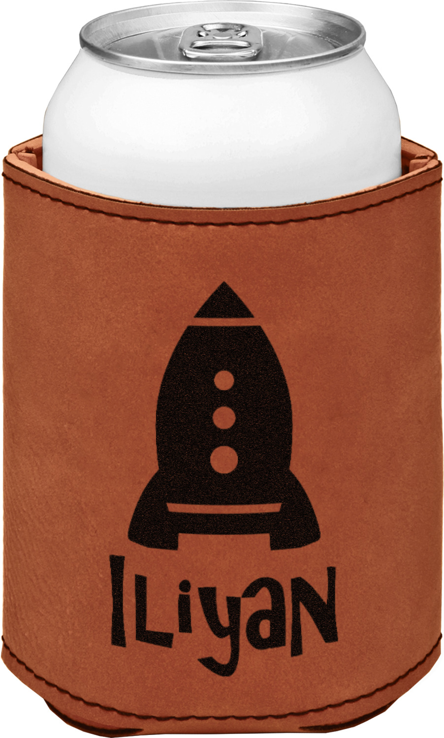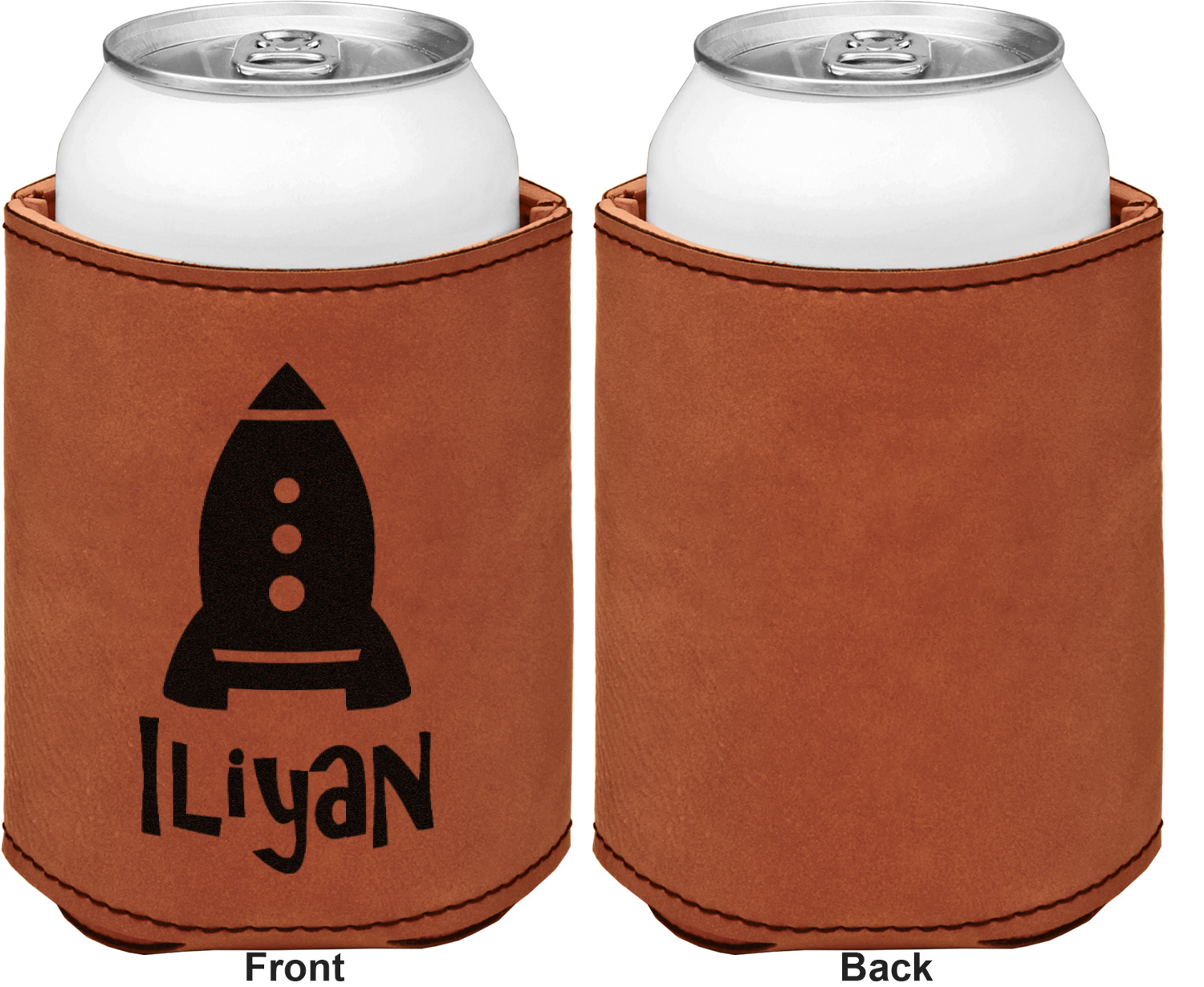 This can sleeve is made from a cognac-brown leatherette and stitched with a sturdy, black thread. A slim padding lines the inside of your can sleeve to allow for a better fit once your drink is inserted. The sleeve itself measures at 4 by 4.5 inches, allowing this custom can sleeve to accommodate most canned drinks. Your personalized design can be engraved on the front and back, or solely the front. When laser-engraved, your design appears as a black coloration which contrasts the leatherette nicely.