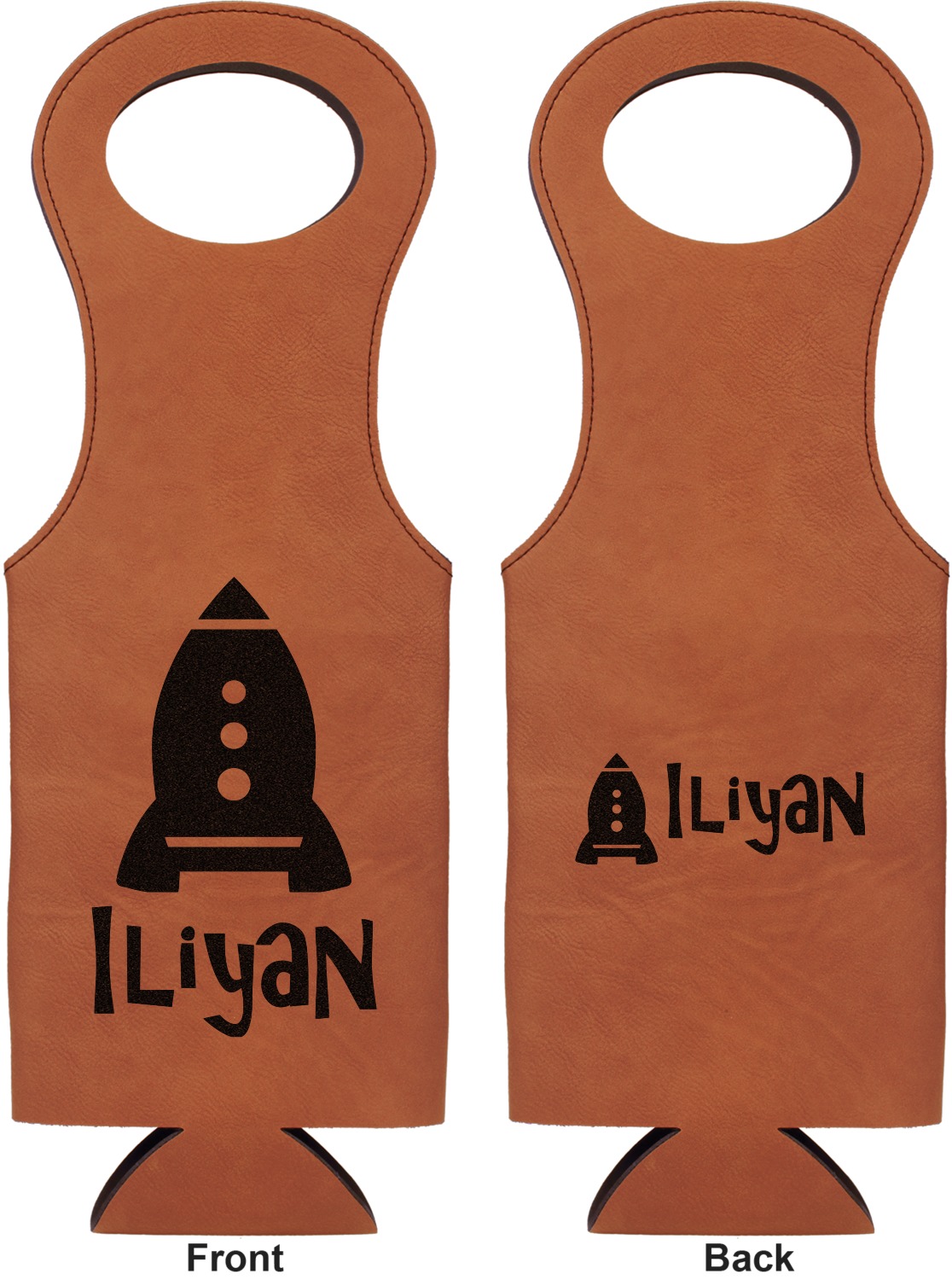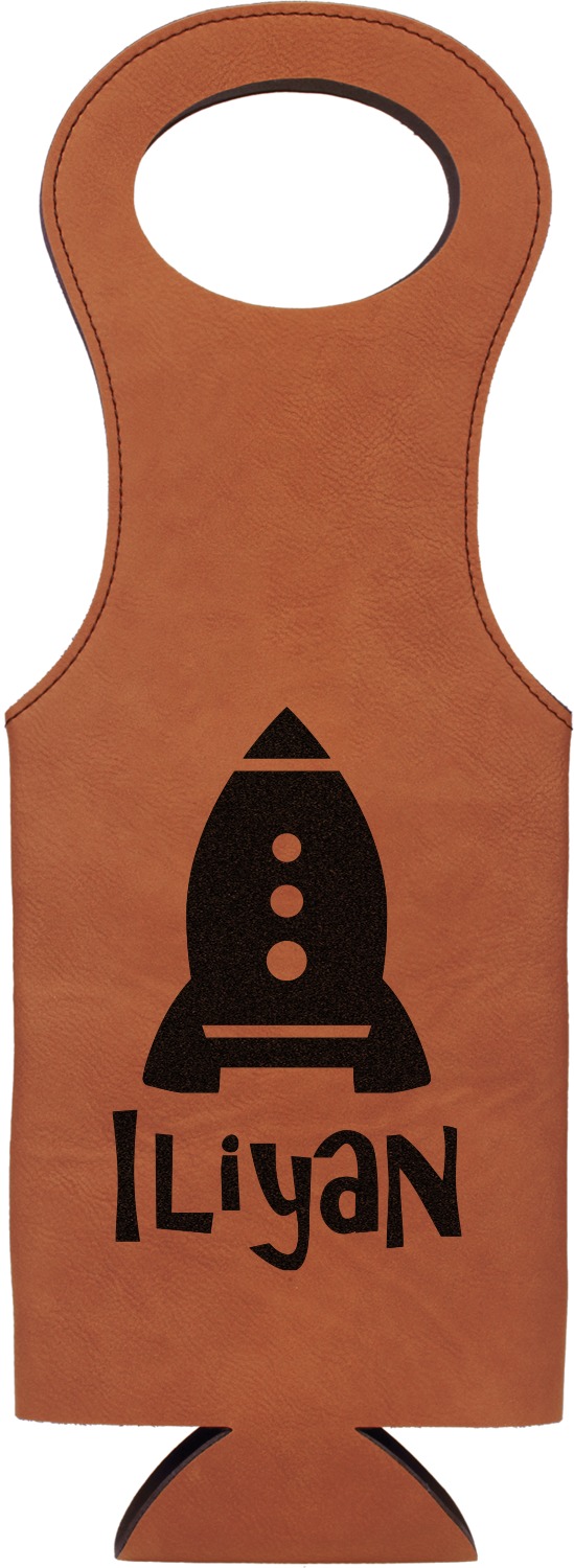 This wine carrier is made from a stunning leatherette, in a cognac-brown color. Strong, black stitching lines the sides of your wine bottle bag and provides extra durability. The interior is lined with a padded, black material to allow for a snug fit once your bottle is placed inside. At the top of this wine gift bag, you'll find two oval shaped handles that elegantly complements the rest of the bag's style. We provide you with the option of laser-engraving the front, or the front and back of your new personalized wine bag!