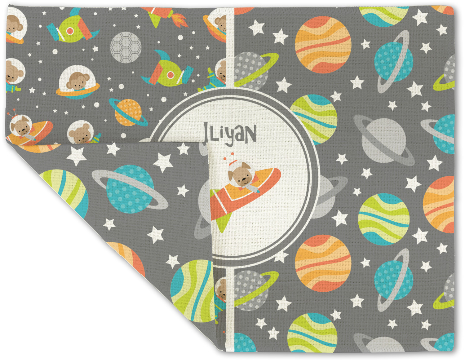 The design is filled with adorable little animal friends in space suits and space ships! On the other side, there are cute little coordinating planets! The bright colors on the animals and planets make for a great contrast to the dark grey background.