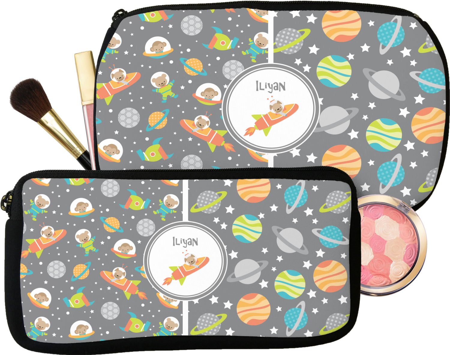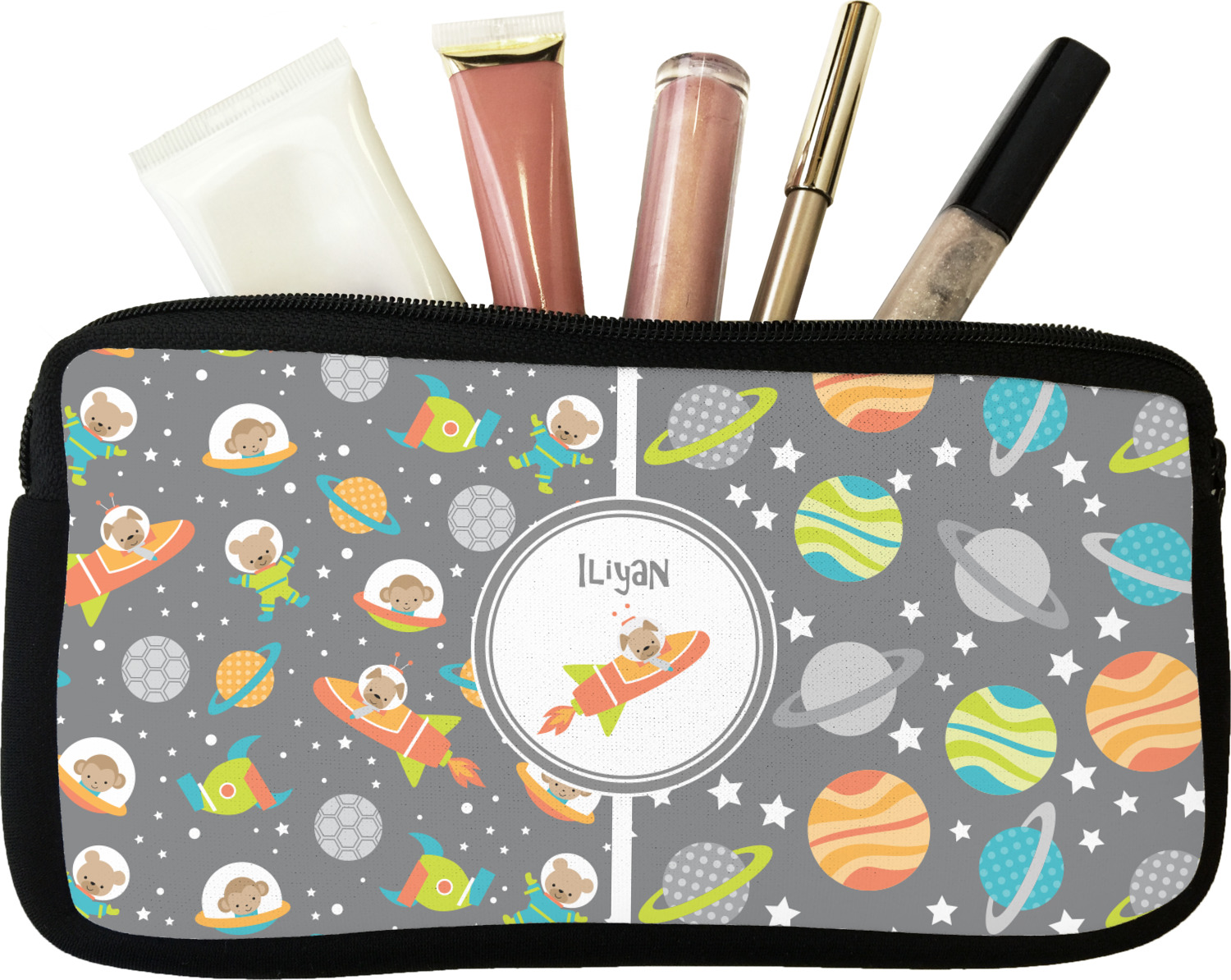 Our personalized makeup bags are available in many different designs, patterns and colors - so you are sure to find one that will love. They are made of neoprene (same material as wet-suits) and thus are water resistant, so spillages in your makeup bag will not end up all over you purse. They are customized on one side and are black on the other side and the zipper is black as well.