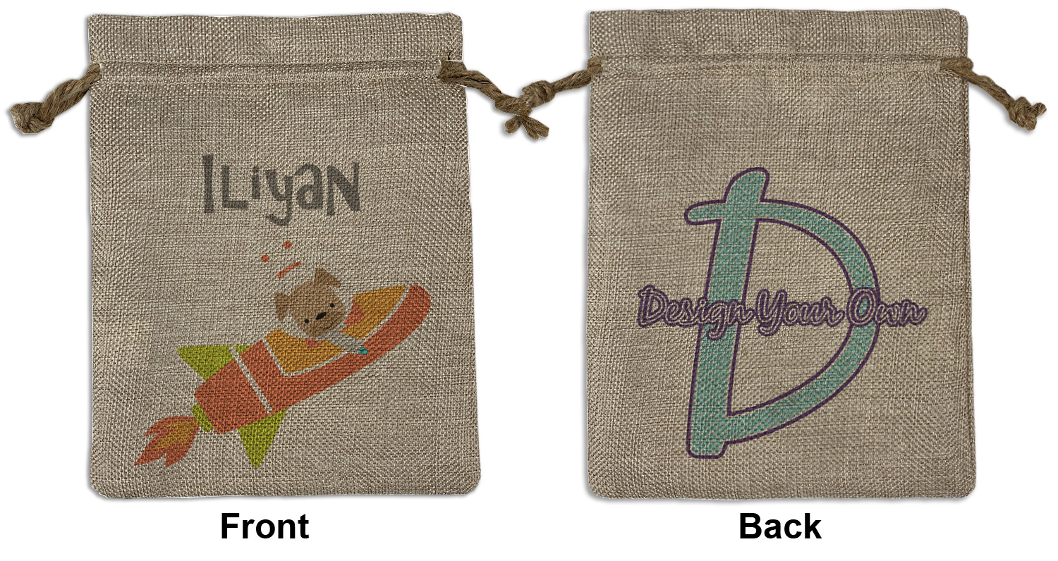 We sell our Burlap Gift Bags in 3 variant sized bags. Made with burlap polyester, each personalized bag can be secured with a twine drawstring pull. Your custom design is available to print on one side or both sides - completely up to you! The sizes of the bags measure approximately 4.5" x 6.5" for the smallest size, 6.5" x 8.0" for the medium size, and 6.5" x 13.5" for the large-sized bag.