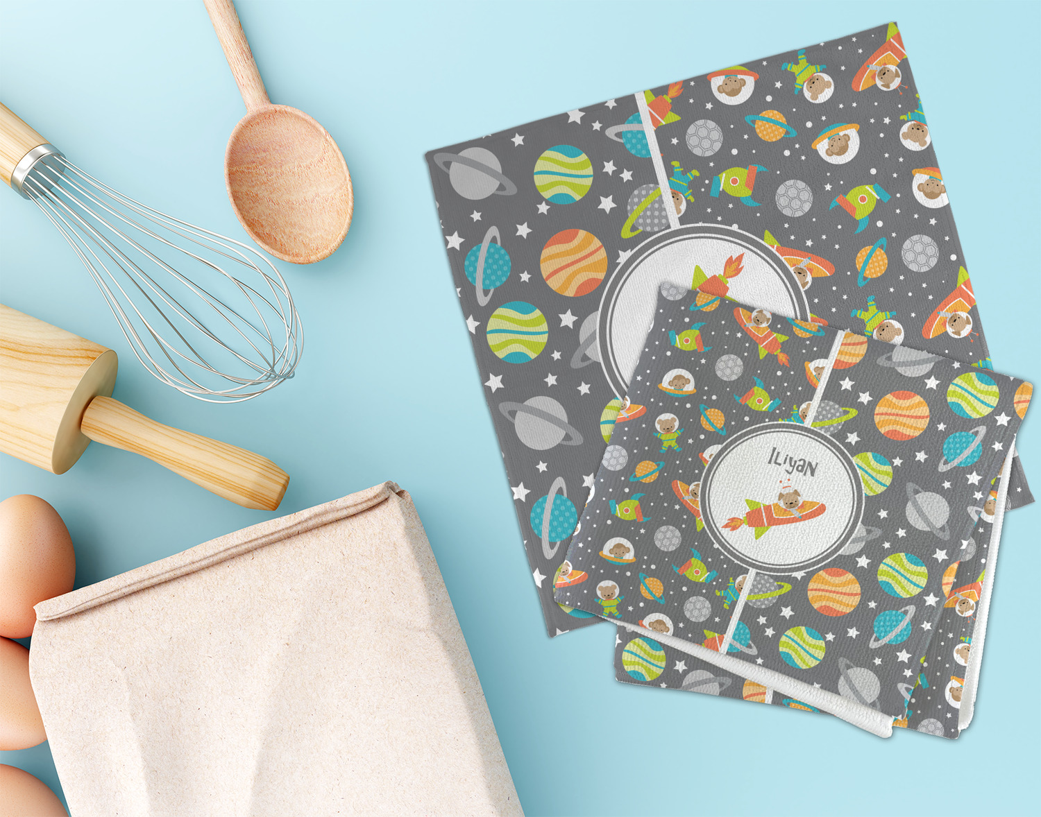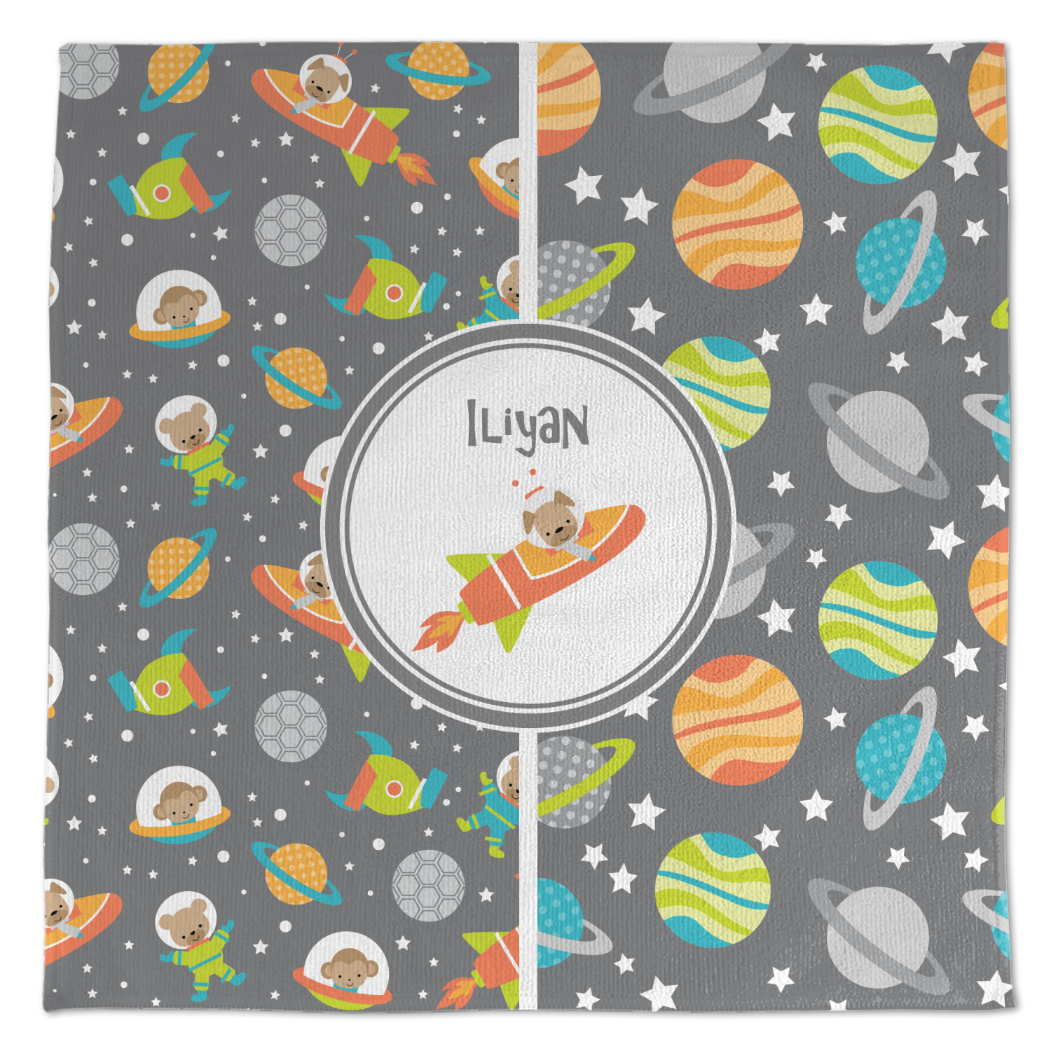 The design is filled with adorable little animal friends in space suits and space ships! On the other side, there are cute little coordinating planets! The bright colors on the animals and planets make for a great contrast to the dark grey background.
