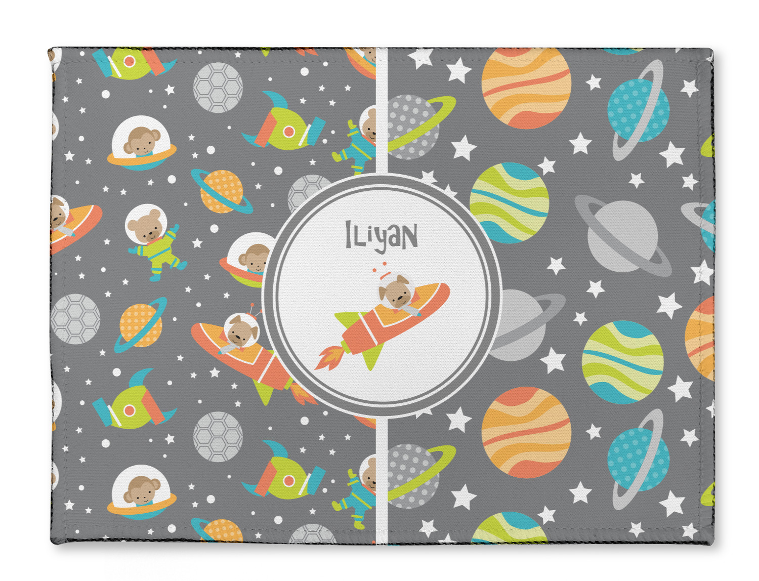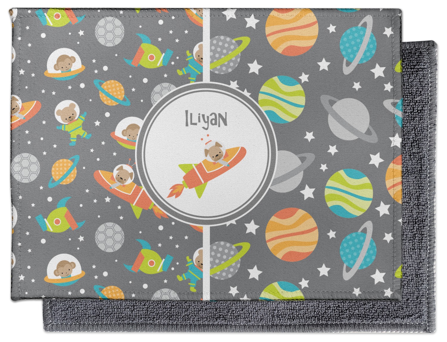 The design is filled with adorable little animal friends in space suits and space ships! On the other side, there are cute little coordinating planets! The bright colors on the animals and planets make for a great contrast to the dark grey background.