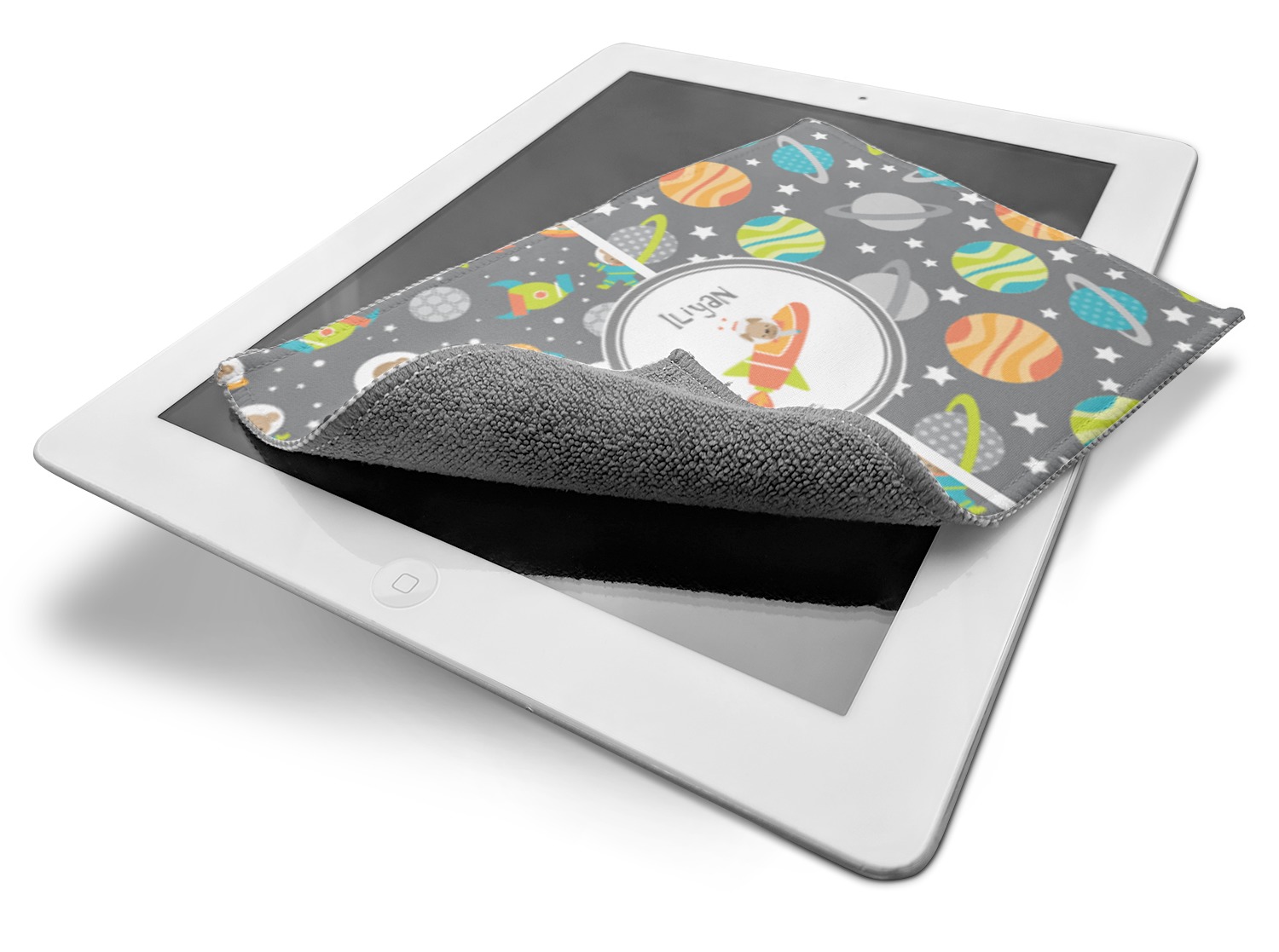 The back of this cleaning cloth is made from a gentle, grey microfiber material, that is masterful at removing smudges, grease, and fingerprints from lenses or electronic screens. The front side of the screen cleaner displays your personalized design in vibrant color. A beautiful stitch lines the edges and secures the microfiber to the polyester top. We provide you with the option of customizing this screen horizontally or vertically, depending on your preferences.