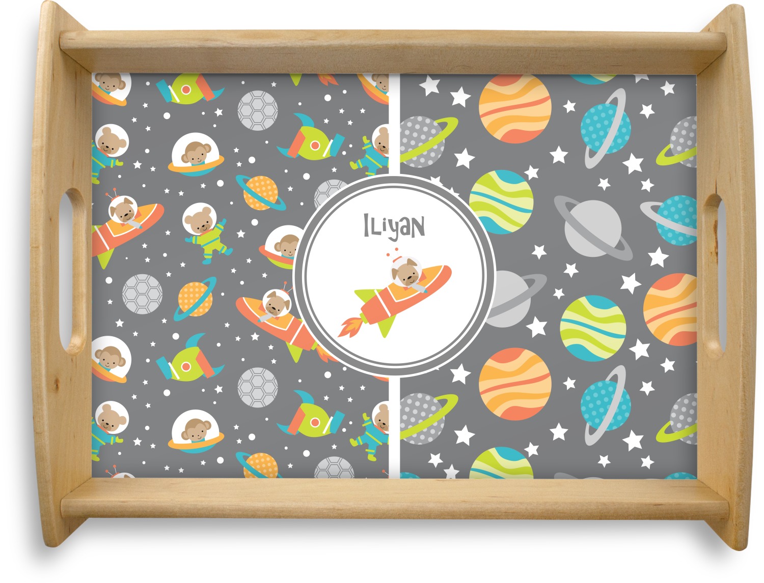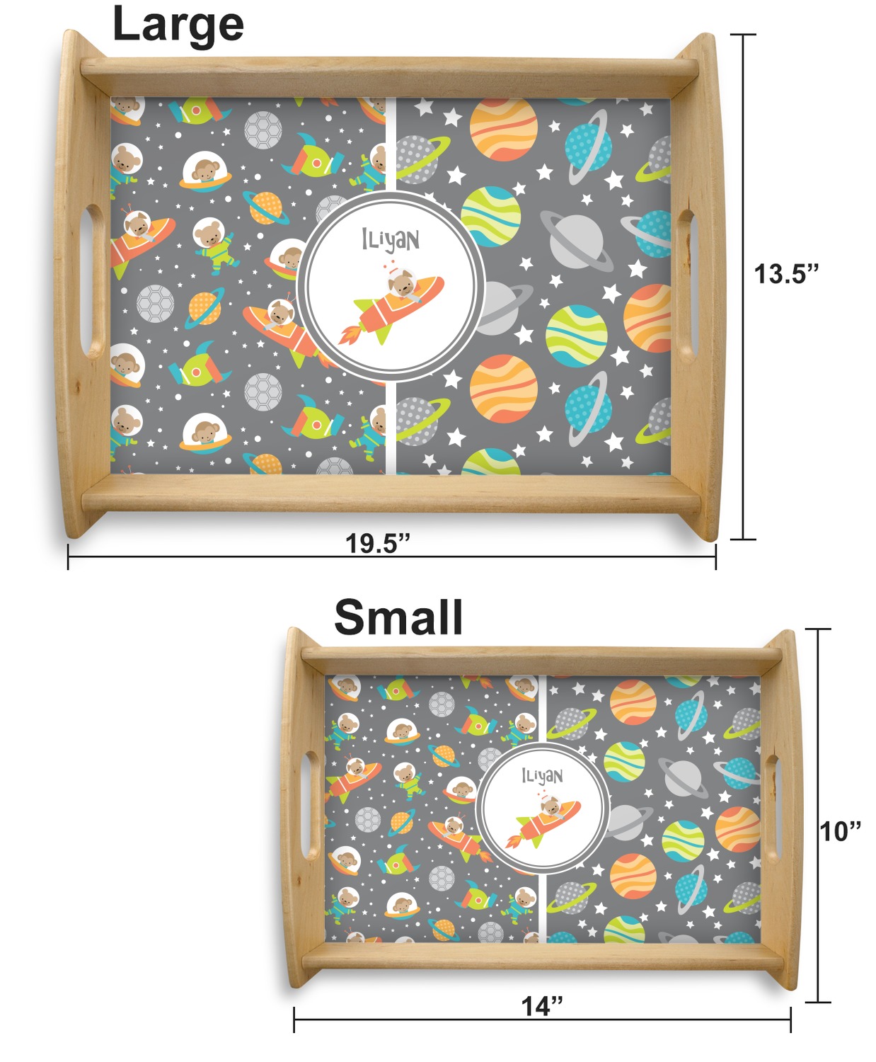 This serving tray with handles features square edges and two rounded sides, creating a very modern look. Each side is fabricated from a beautifully cut, natural wood. The bottom of the interior of the tray displays your customized design in bright, vibrant color. The tray is sold in both a black color and a natural wood look. Each variation of the wood serving tray has two sizes: Small, which is 14" x 10" x 2.25", and Large, which is 19.5" x 13.5" x 2.75".